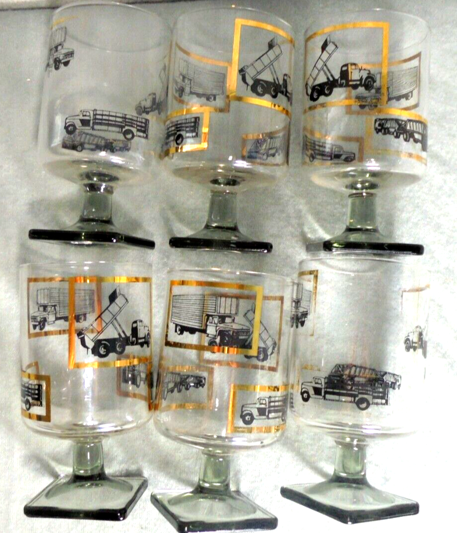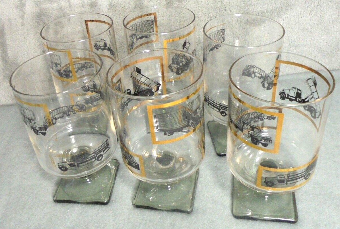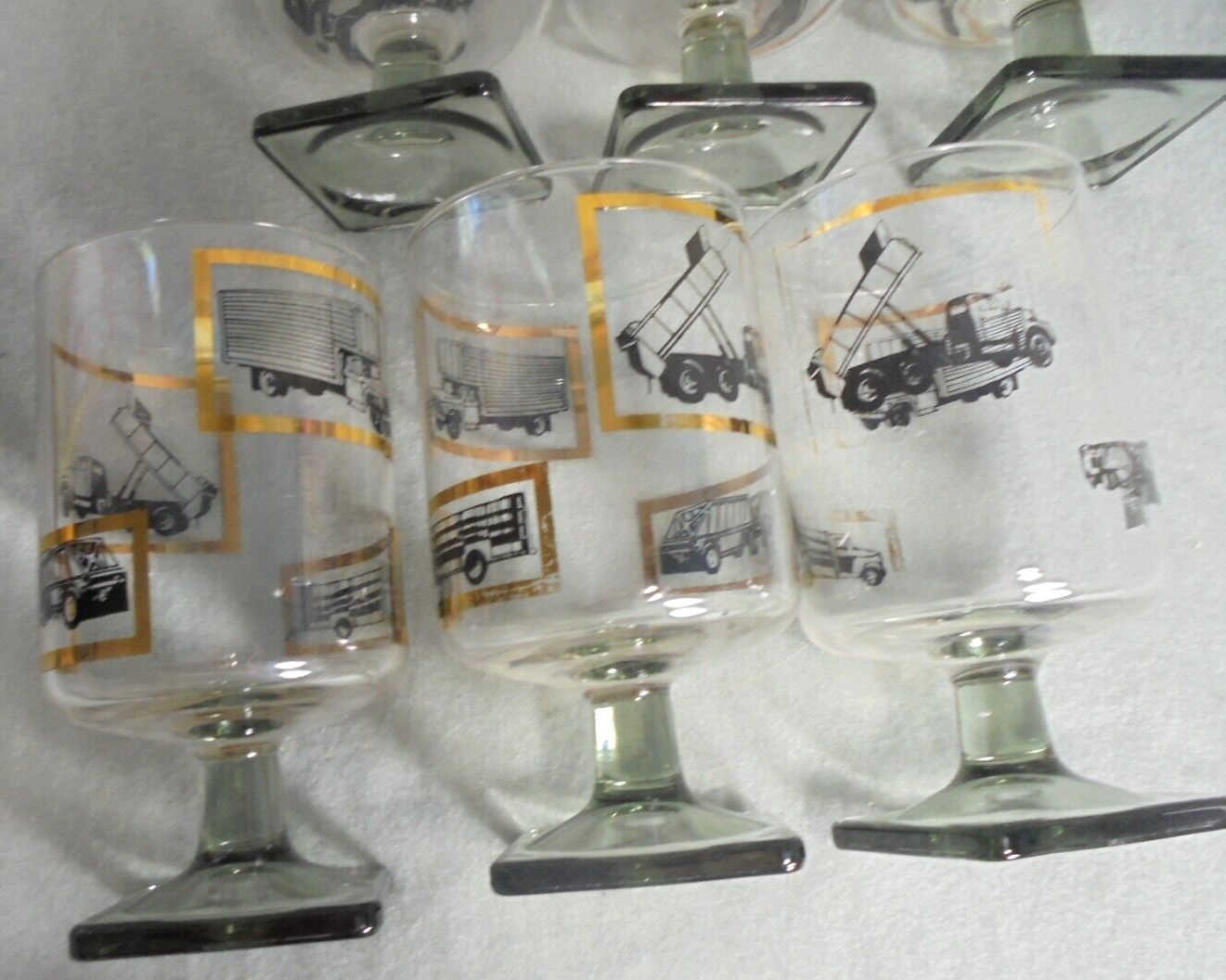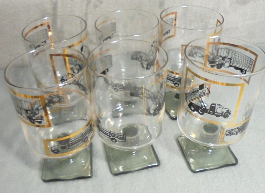 Vintage Lot of 6 MCM Truck Print Gold Gilded Pedestal Clear Drinking Glasses