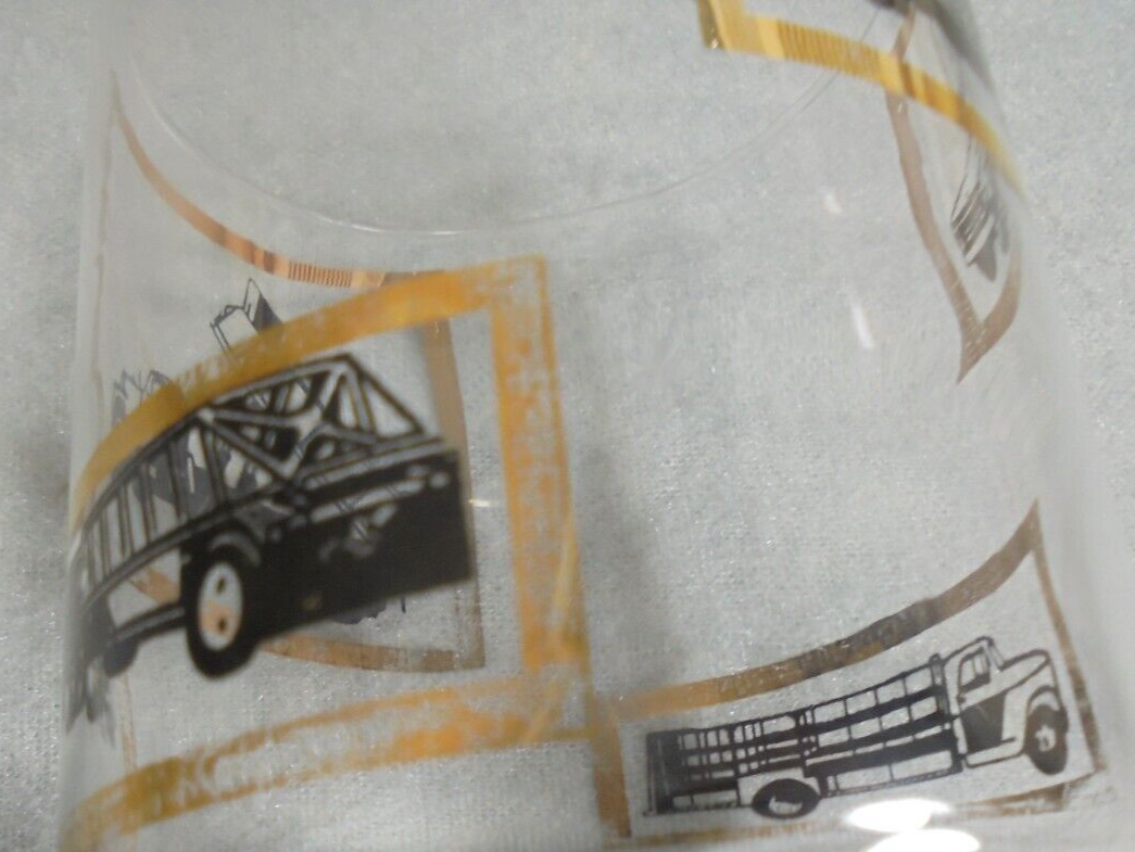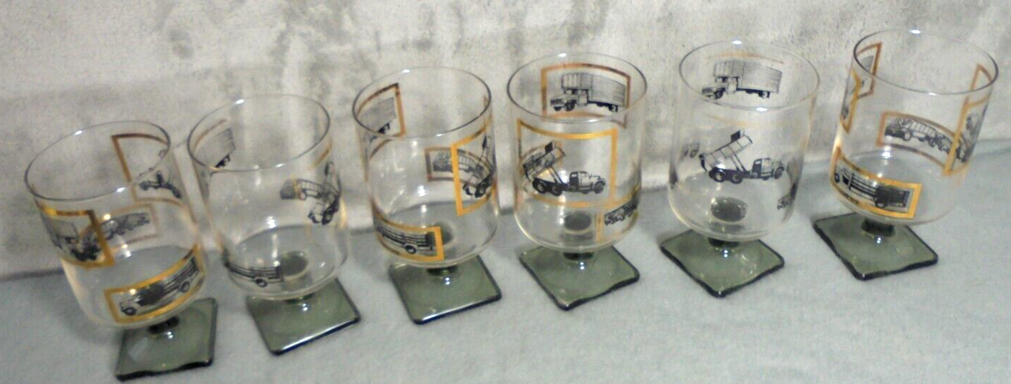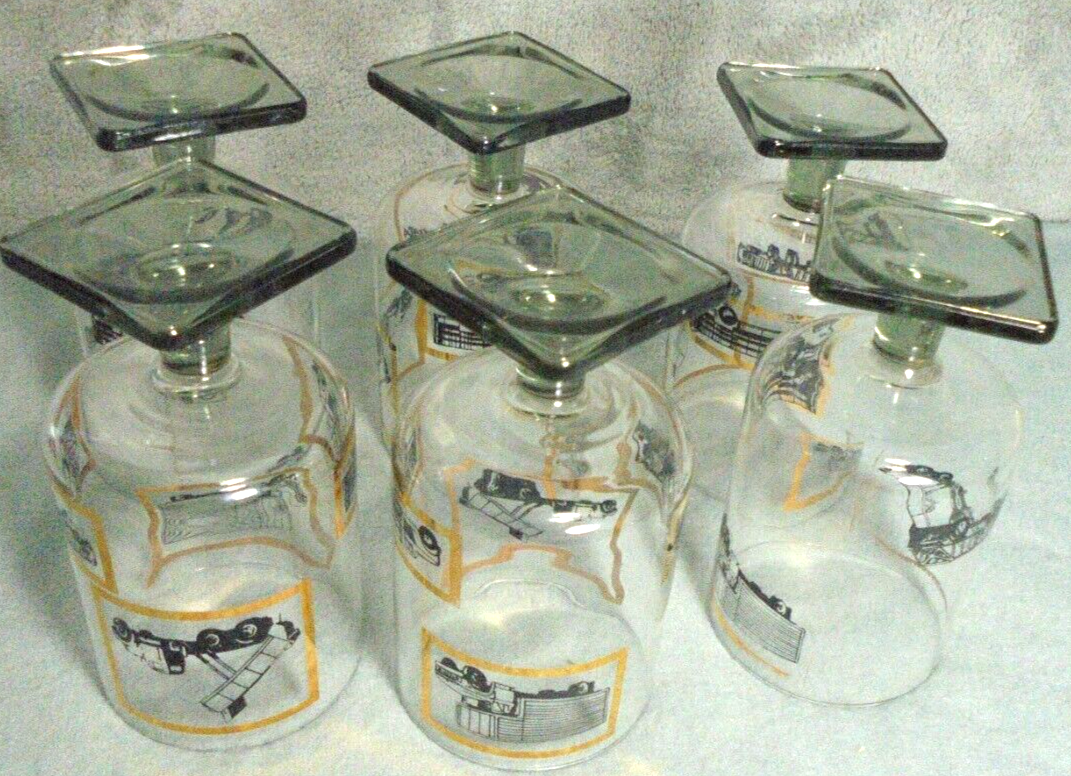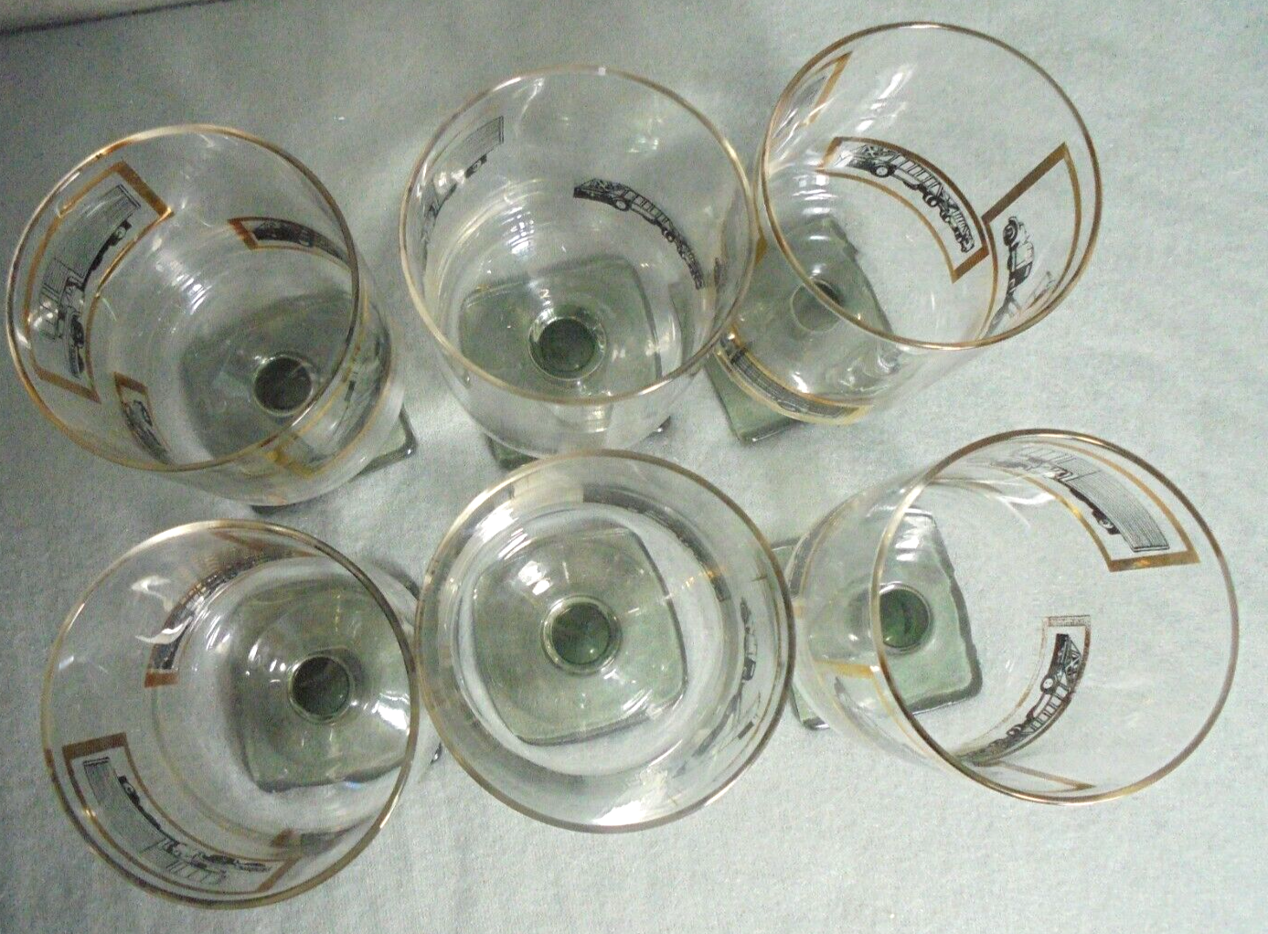 Vintage Lot of 6 MCM Truck Print Gold Gilded Pedestal Clear Drinking Glasses