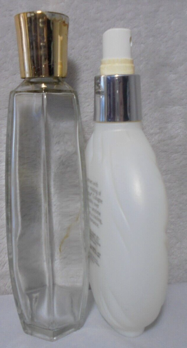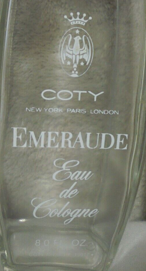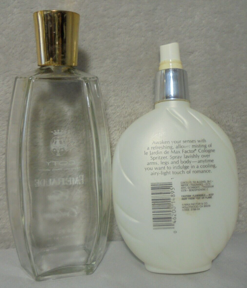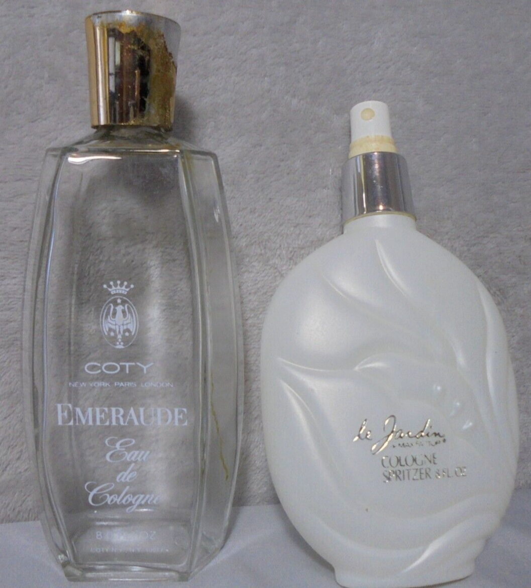 Description: Emeraude eau de cologne 8.0 fl. oz. glass bottle with screw on top. Le Jardin Cologne Spritzer 8 fl. oz spray bottle. Both bottles have been emptied.
