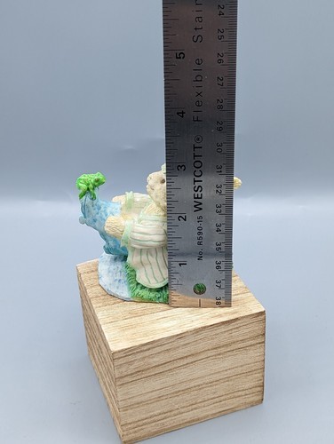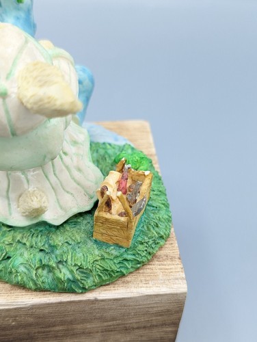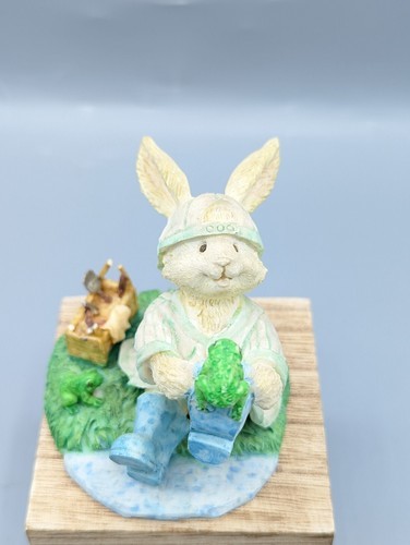 This little 3.5" x 3" bunny rabbit is pulling on its boots to do some gardening with his garden tools and a frog beside him on his toe.
