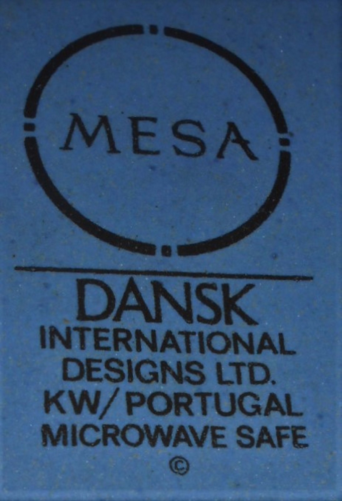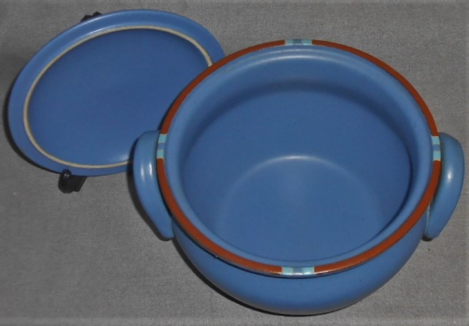 This is the Tureen with a Lid from Dank in the Blue Mesa Pattern and Made in Portugal. It is very nice quality and heavy and measures approx 5 3/4" tall x 8 1/4" across and it is in good pre-owned condition with only flaw a pinpoint sized tiny glaze chip on rim - very minor - no other flaws or damage.