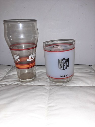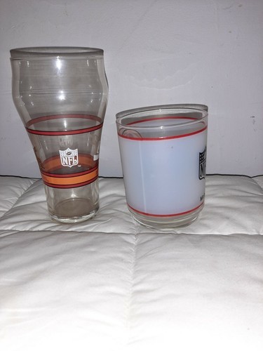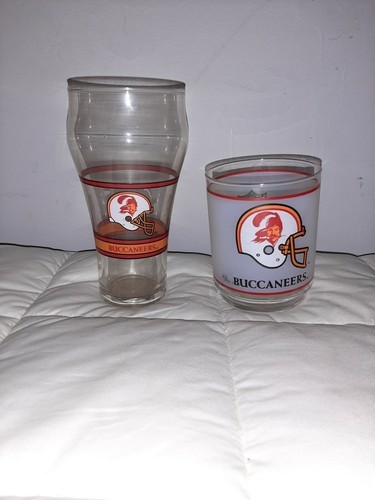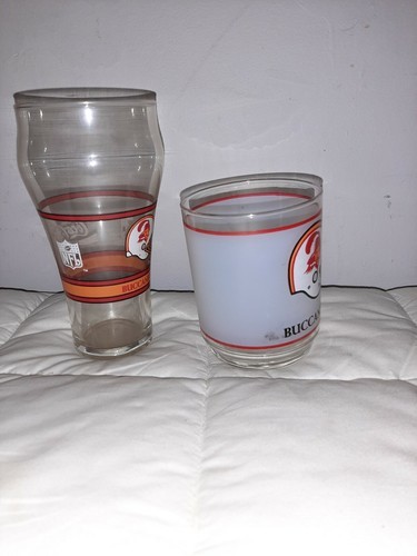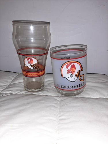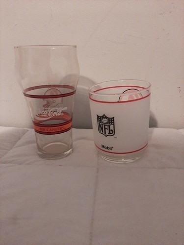 Lot of (2) Vintage Tampa Bay Buccaneers Glasses Frosted with Mobile Trademark Coca Cola Old Logo. The frosted glass is approximately 4 inches tall and the Coca Cola glass is approximately 6.5 inches tall.