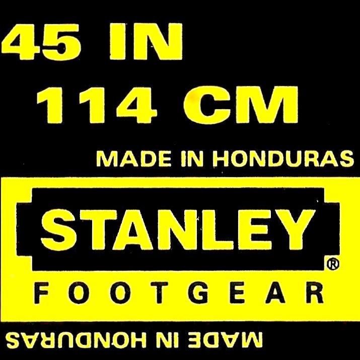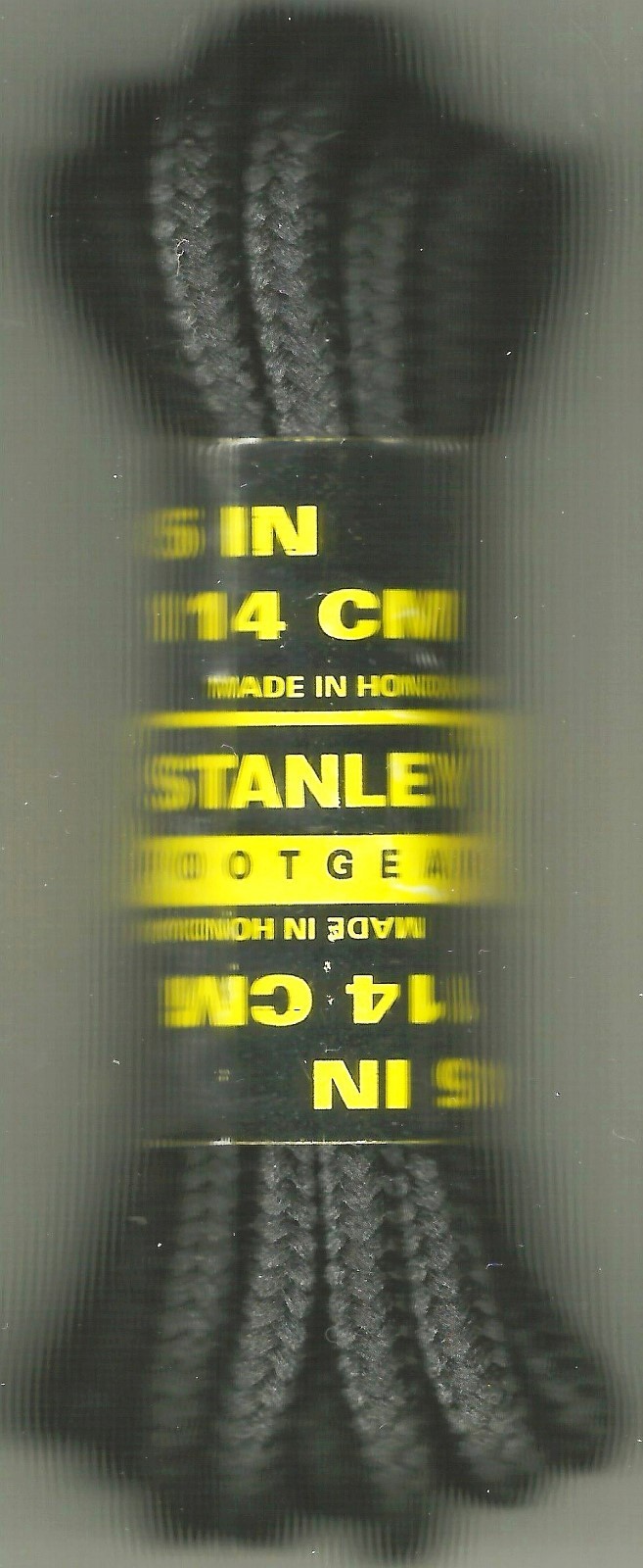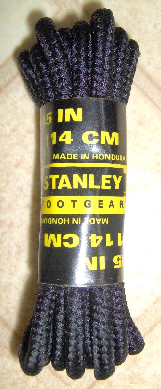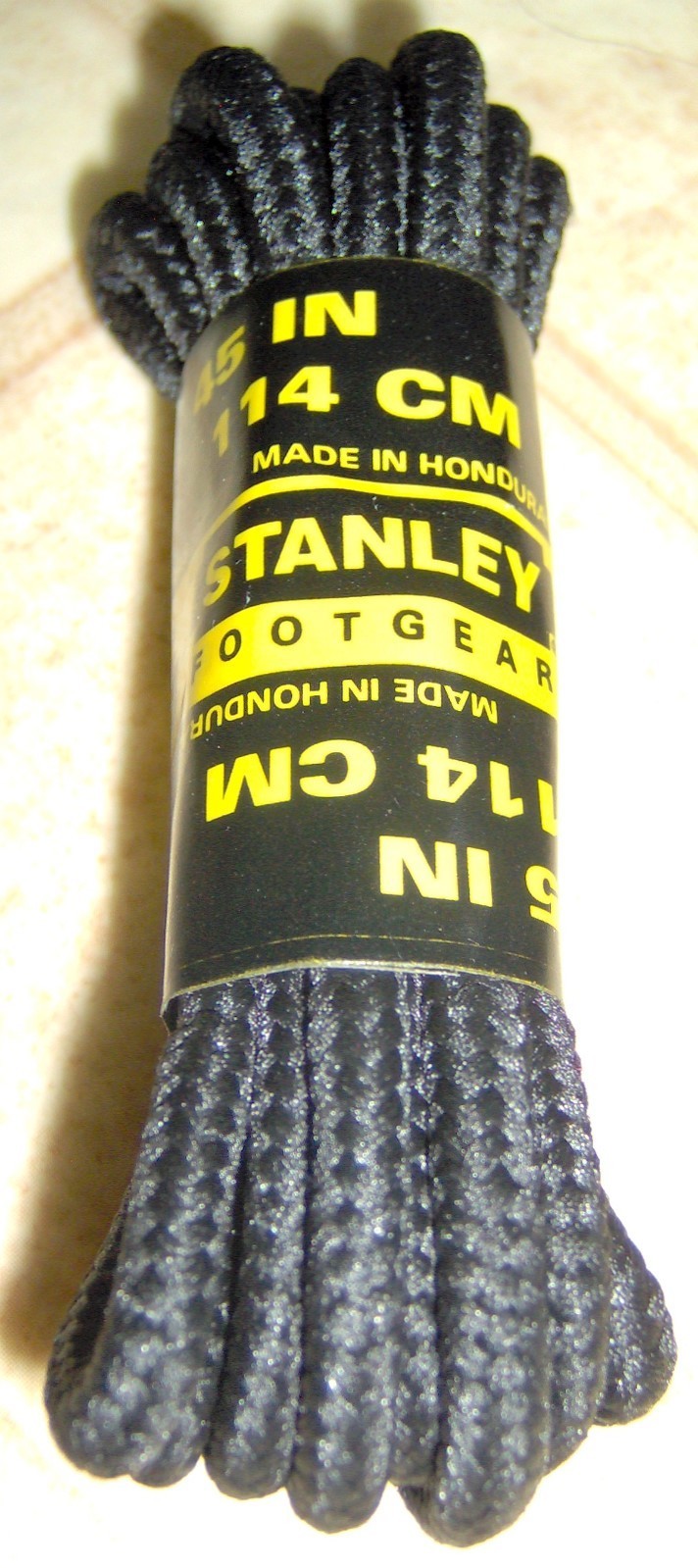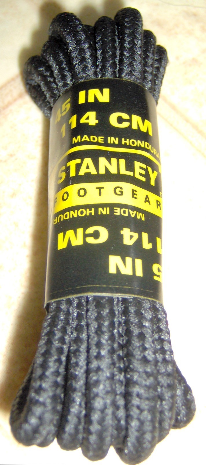 FOR SALE IS ONE (1) NEW PAIR OF 45" BLACK CORD STYLE ROUND BOOT AND SHOE LACES FOR 5 or 6 EYELETS BY STANLEY FOOTGEAR BRAND. THESE ARE MY BEEFIEST (1/5" diameter = 5.3mm diameter), AND THICKEST ROUND, CORD STYLE LACES for 5 and 6 eyelet SHOES, SNEAKERS, WORK, HIKING, MOUNTAIN, SNOW AND MILITARY BOOTS. THICKER THAN MY HEAVIEST DUTY LACES BY KIWI. THESE THICK BLACK 45" BLACK LACES BY GENUINE STANLEY BRAND MAKE THE PERFECT COMPLEMENT TO A STURDY, TOUGH PAIR OF BOOTS. THESE ARE THICK, NYLON BLEND, ROUND, CORD STYLE LACES WITH BLACK PLASTIC END AGLETS. THESE 45" length LACES WILL FIT 5-6 EYELETS, SHOES, SNEAKERS, BOOTS (will also generously fit 4 eyelets). FOR BEST RESULTS, REMOVE YOUR EXISTING LACES AND MEASURE THEM, AND VIEW THE SIZING CHART PICTURE ABOVE. YOU WILL RECEIVE ONE PAIR (total 2 laces) OF STANLEY 45" ROUND BLACK COLOR LACES FOR 5 or 6 EYELETS SHIPPED BY USPS FIRST CLASS MAIL.....