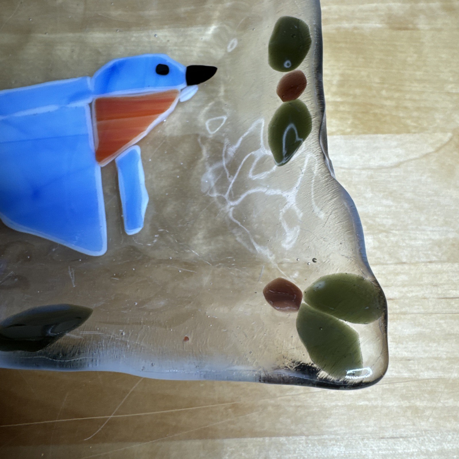 Fused Art Glass Blue Bird Trinket Candy Dish Small Plate 6x6 in Vintage