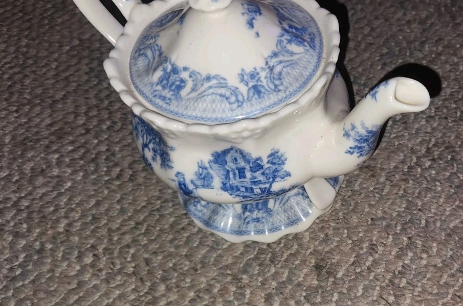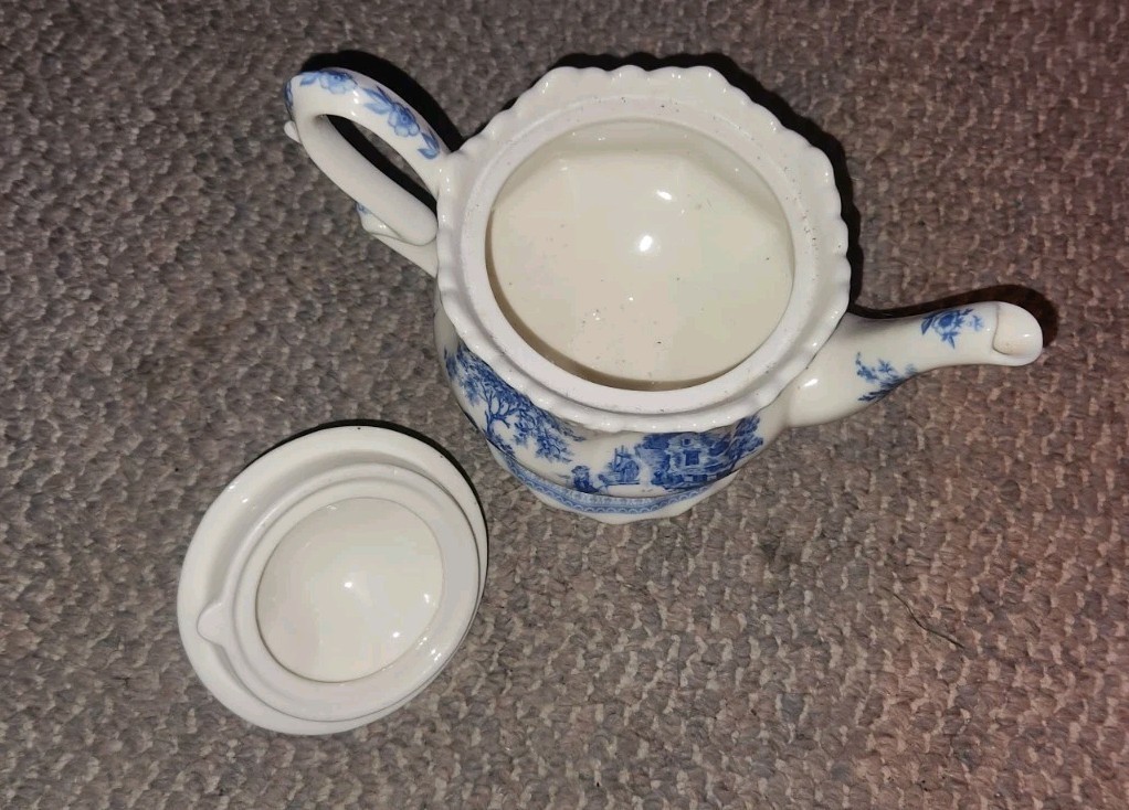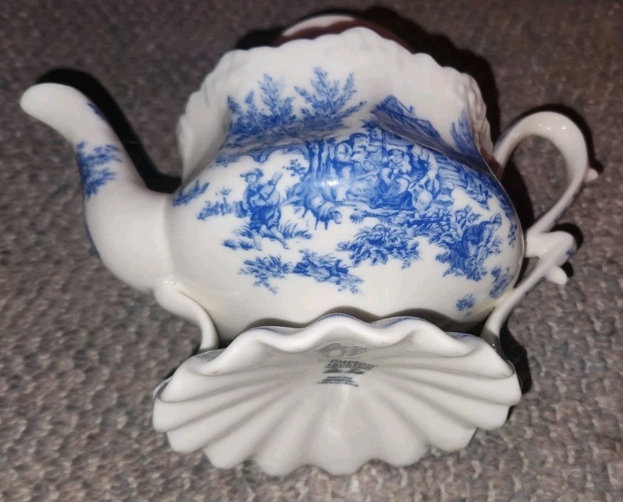 Burton & Burton Blue Fish Toile Teapot Tea Pot Ceramic Homestead Scene Country