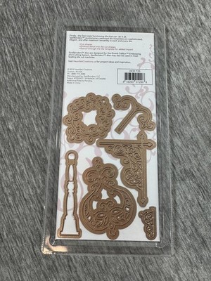 Includes: Ornate corner brackets, filigree heart, circular wreath/scroll frame, upright post/finial accent, and small flourishes (see photos of the actual dies on back)