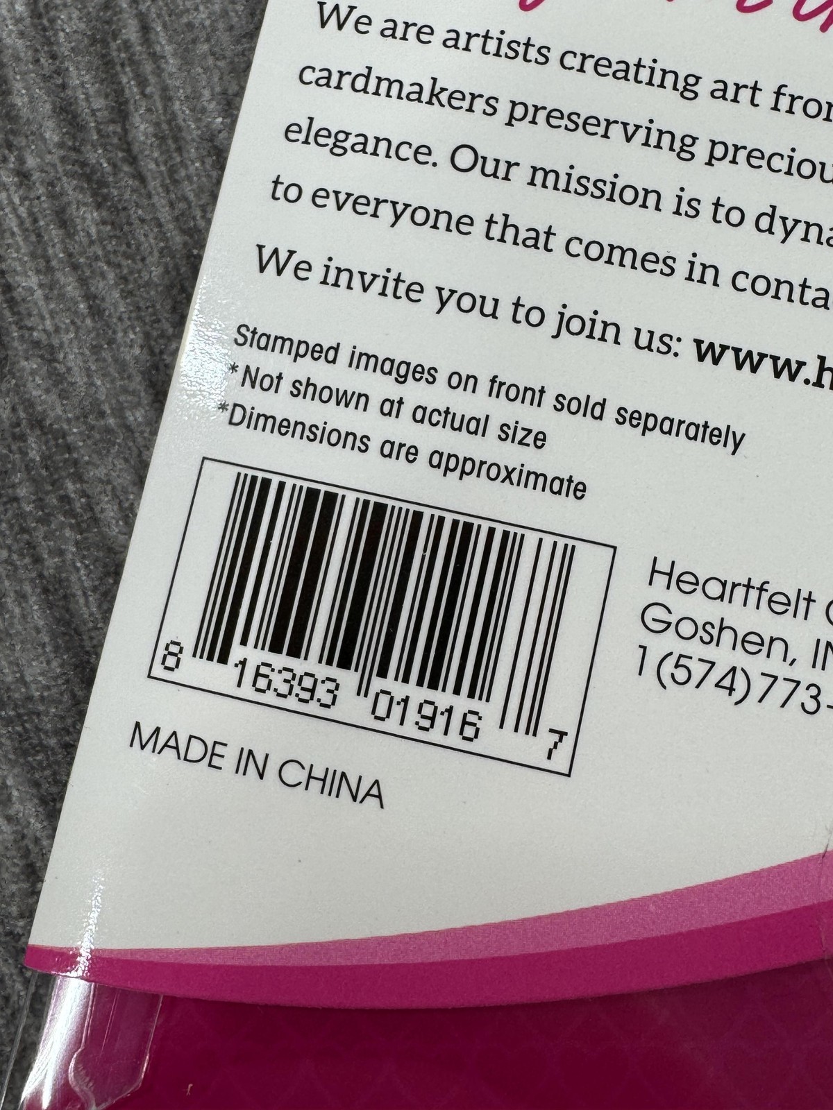 Notes from packaging: Stamped images on front sold separately; not shown at actual size; dimensions are approximate