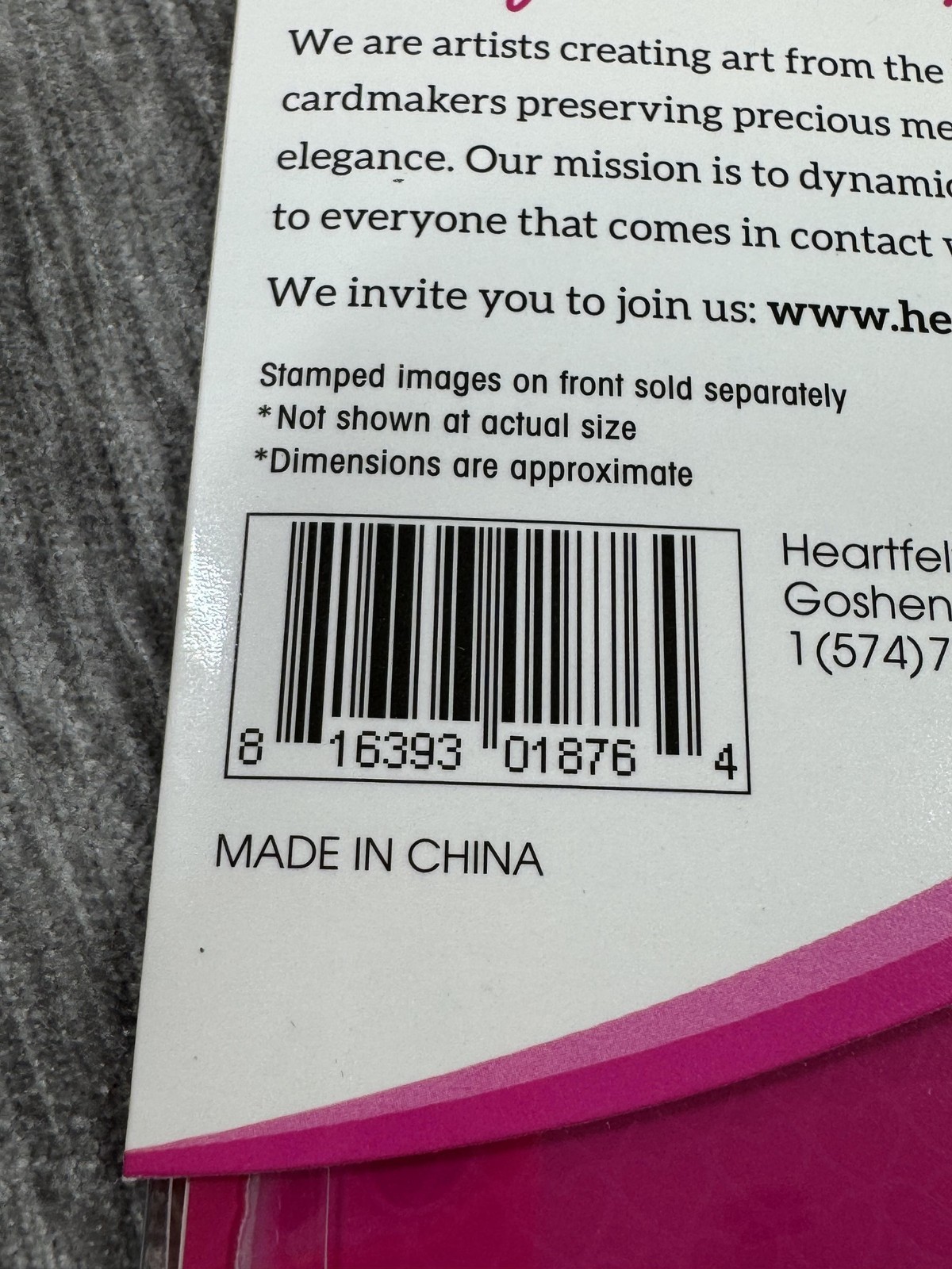 Brand info on packaging: Heartfelt Creations, Goshen, IN, USA
