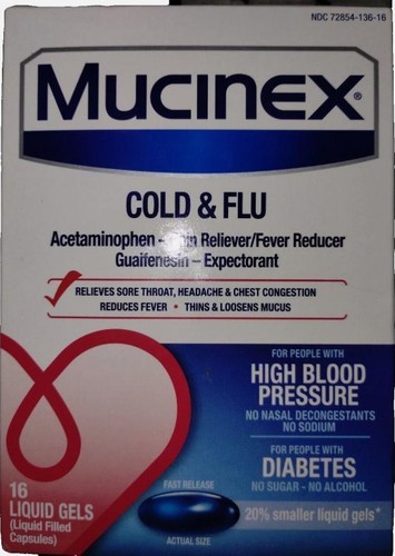 Mucinex Cold Flu High Blood Pressure Liquid Gels*09/2025* 16 ct