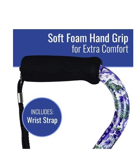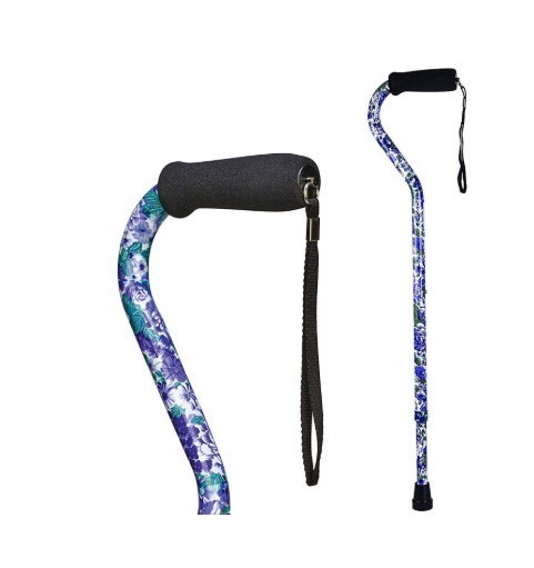 The DMI Adjustable Designer Cane with Offset Handle is a lightweight, anodized aluminum walking aid supporting up to 250 pounds. Adjustable from 30 to 39 inches with ten height settings, it features a comfortable padded foam grip with a secure wrist strap and a slip-resistant rubber tip for enhanced stability. Designed with a stylish purple floral pattern, it blends functionality with fashion for the modern user.