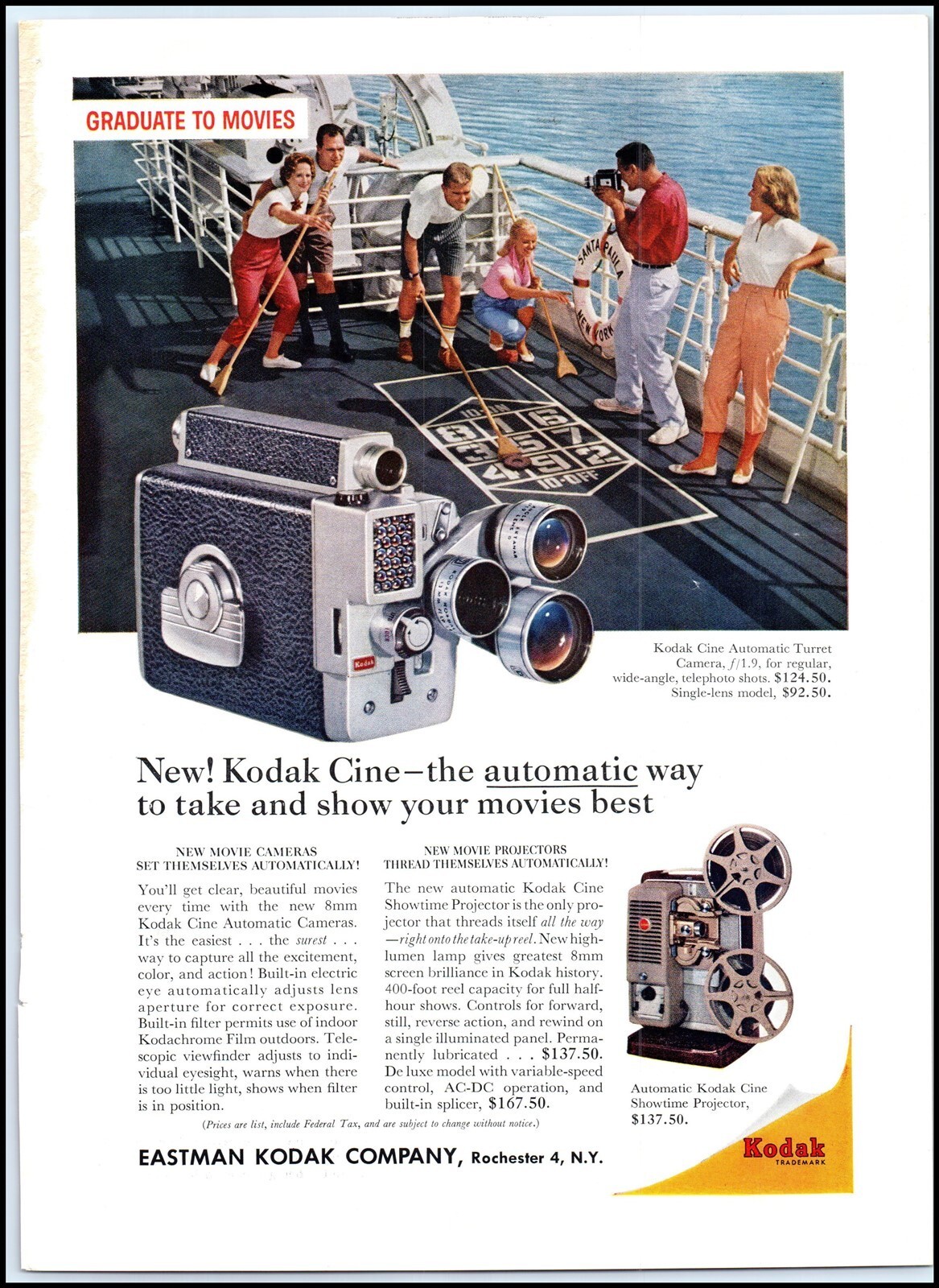1950s Kodak Cine Automatic Turret Movie Camera PRINT AD Shuffleboard on Ship BX4