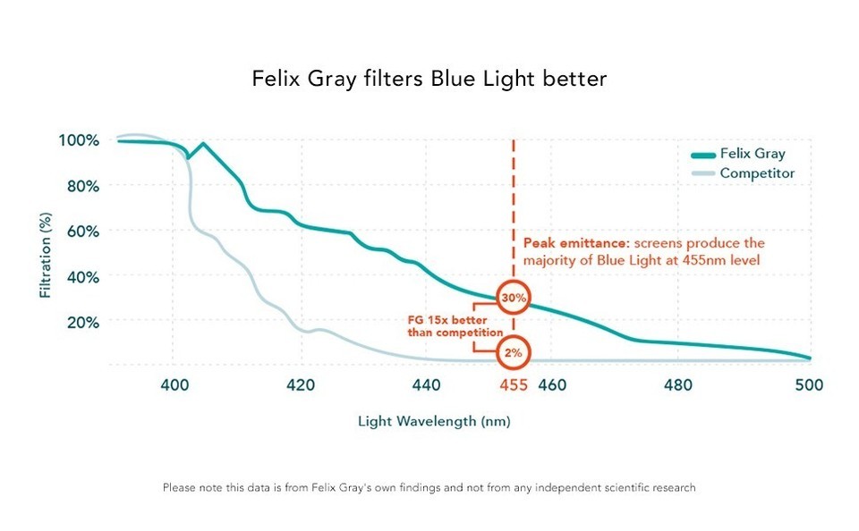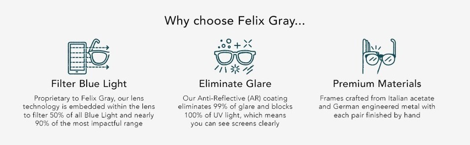 THE FELIX GRAY DIFFERENCE ? Felix Gray?s proprietary filtering technology is embedded directly within lenses, so 50% of all Blue Light and almost 90% of the highest range are filtered out. Premium anti-glare and UV protection are also applied, with no blue-reflective coating and an unnoticeable tint.