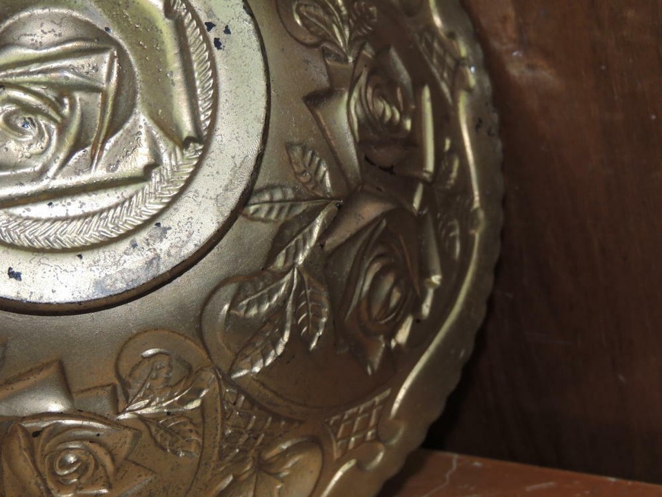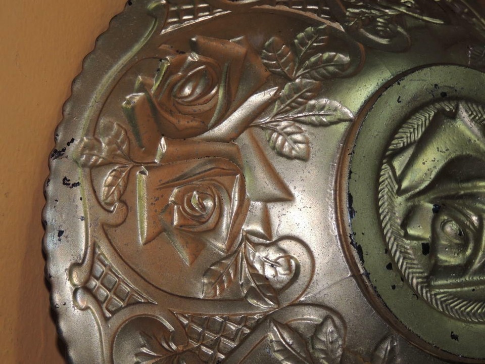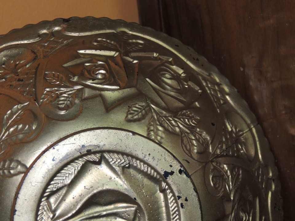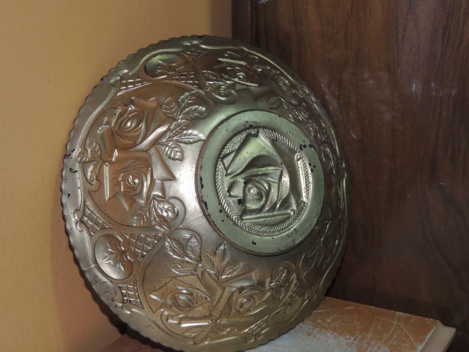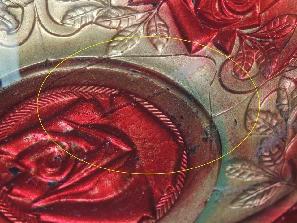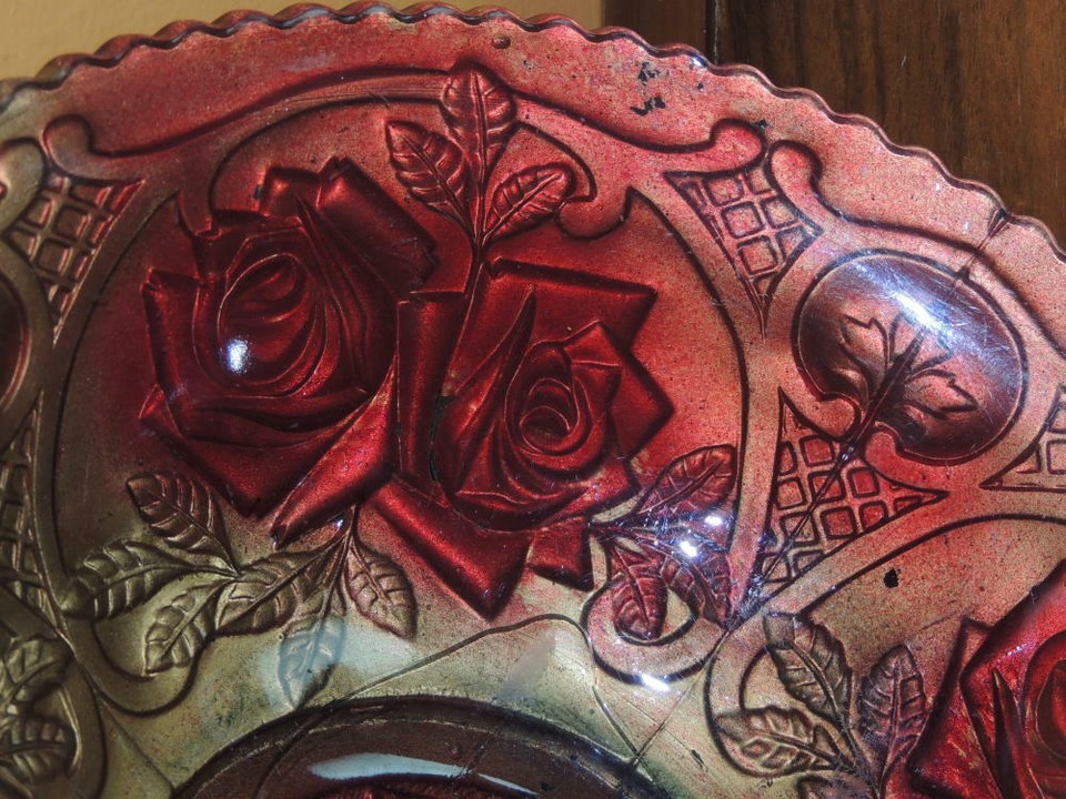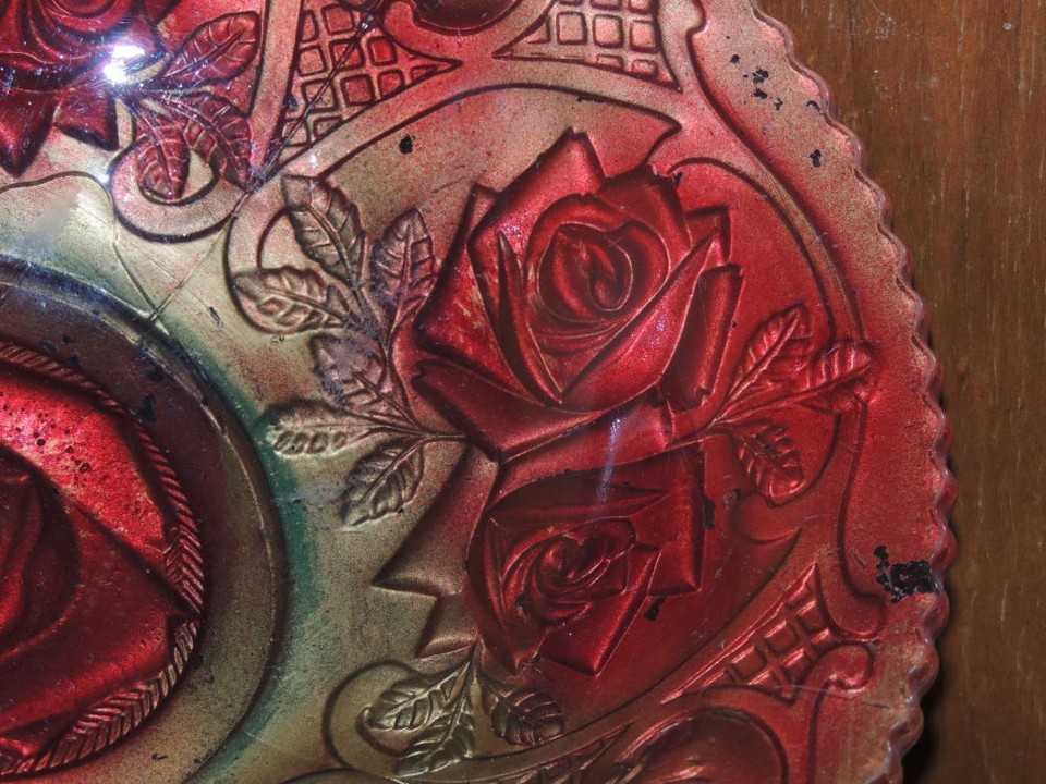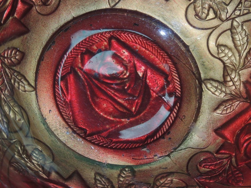 Antique 9" Goofus Glass Bowl Double Rose pattern Gold Red relief embossed EAPG