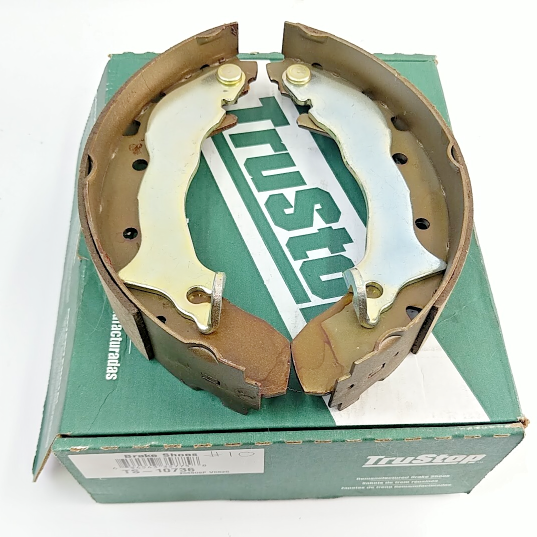 Exact item set is shown. New old stock organic brake shoes, may include partial packaging. Set weight 4.75 lbs. Shoe width 1.75 inches. Made in USA. No returns on installed items or partial sets. Please review our business policies in our store for information regarding returns, shipping and warranties.