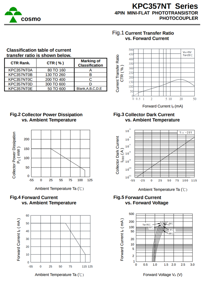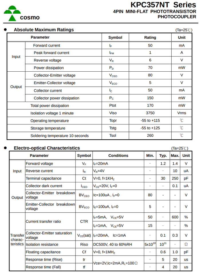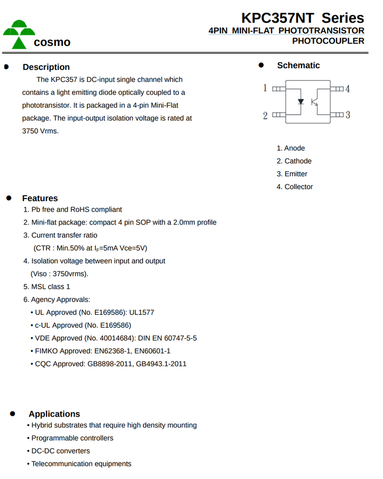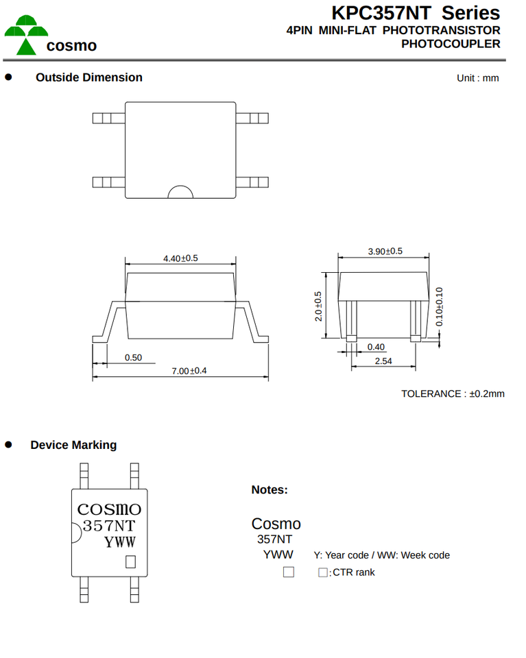 KPC357NT0B COSMO 4 Pin Mini Flat Phototransistor Photocoupler CTR 130-260% DC Input