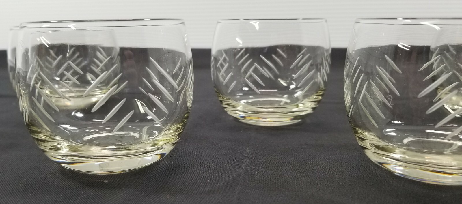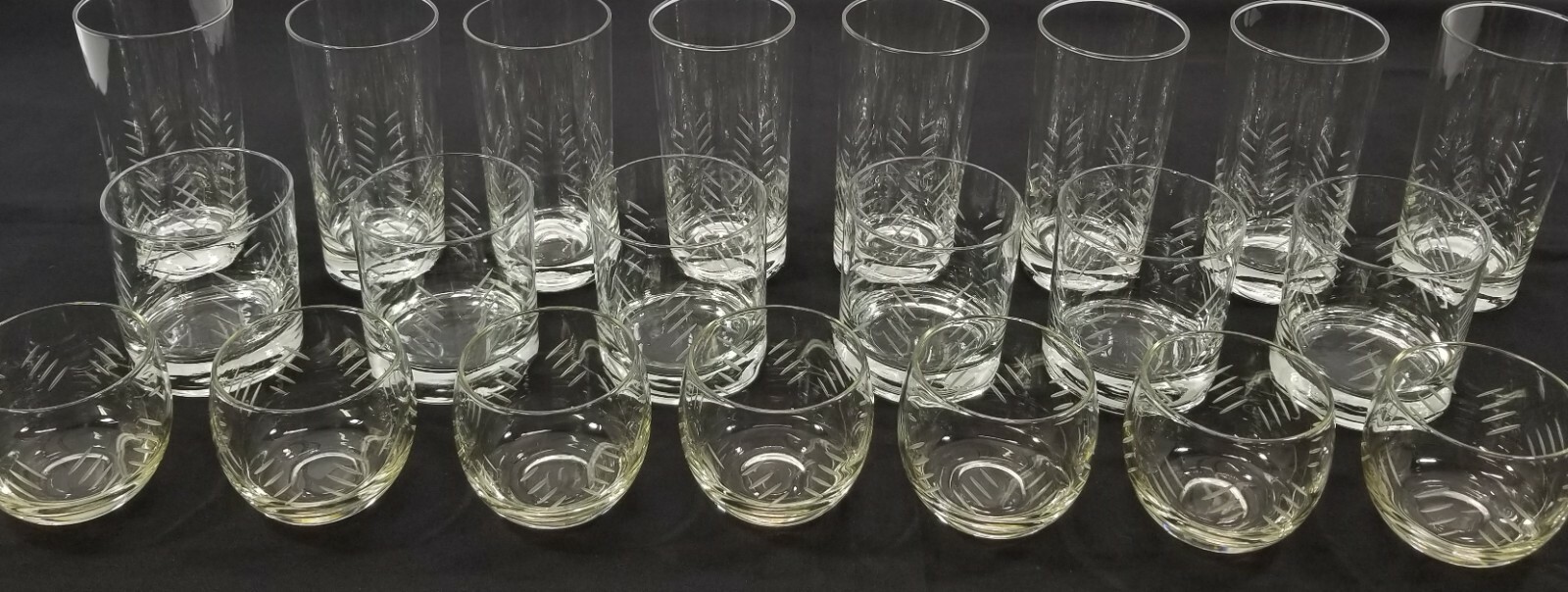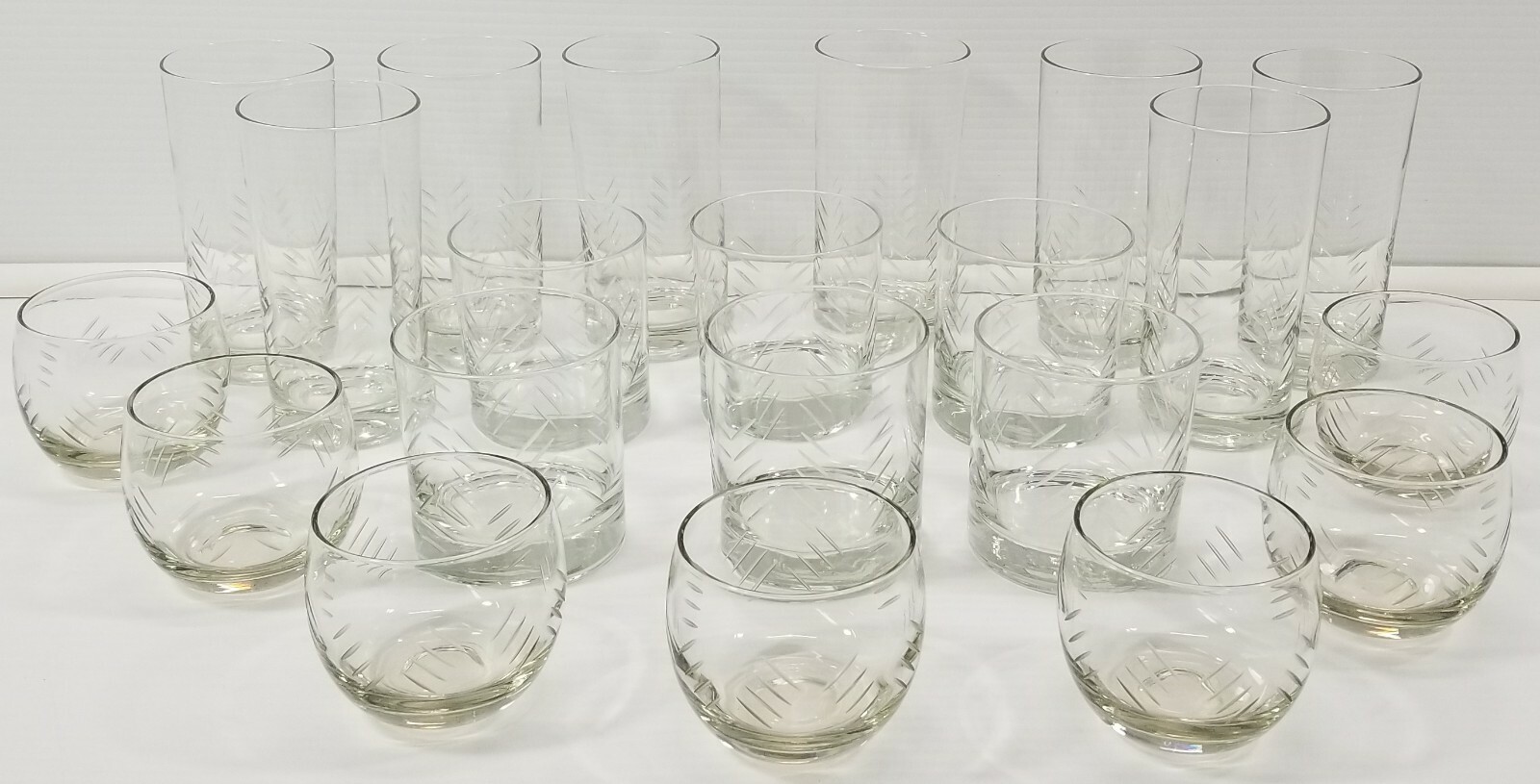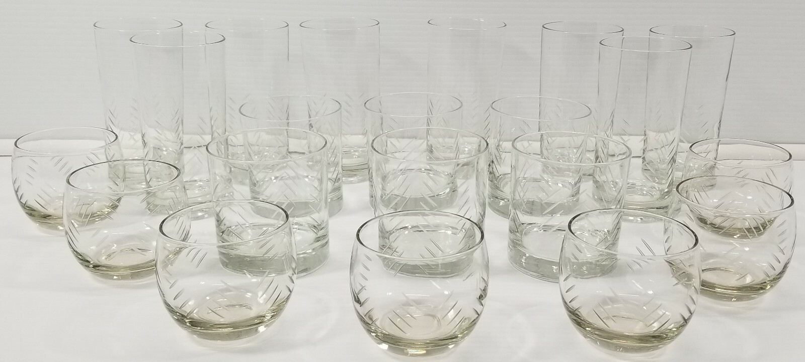 All glasses are in overall good, vintage used condition. There is one visible chip on the rim of a short rock glass. Please see picture. Lot is remainder of a set and NOT COMPLETE.