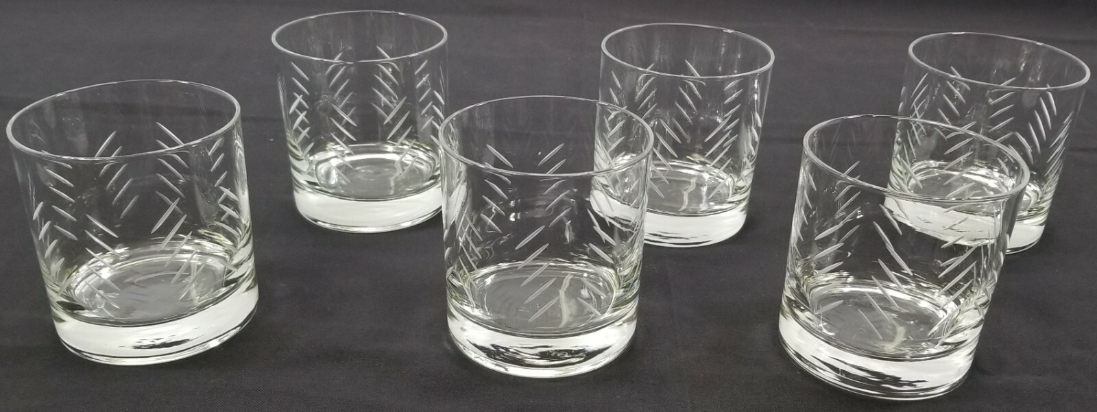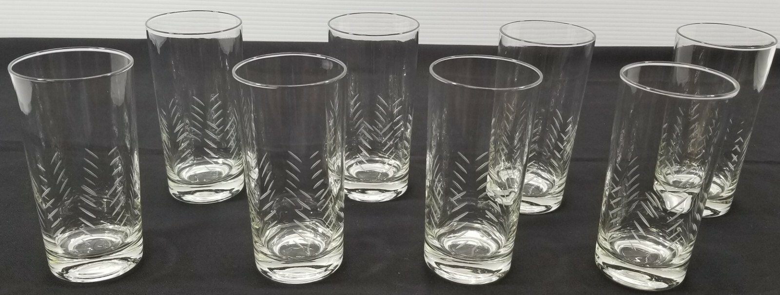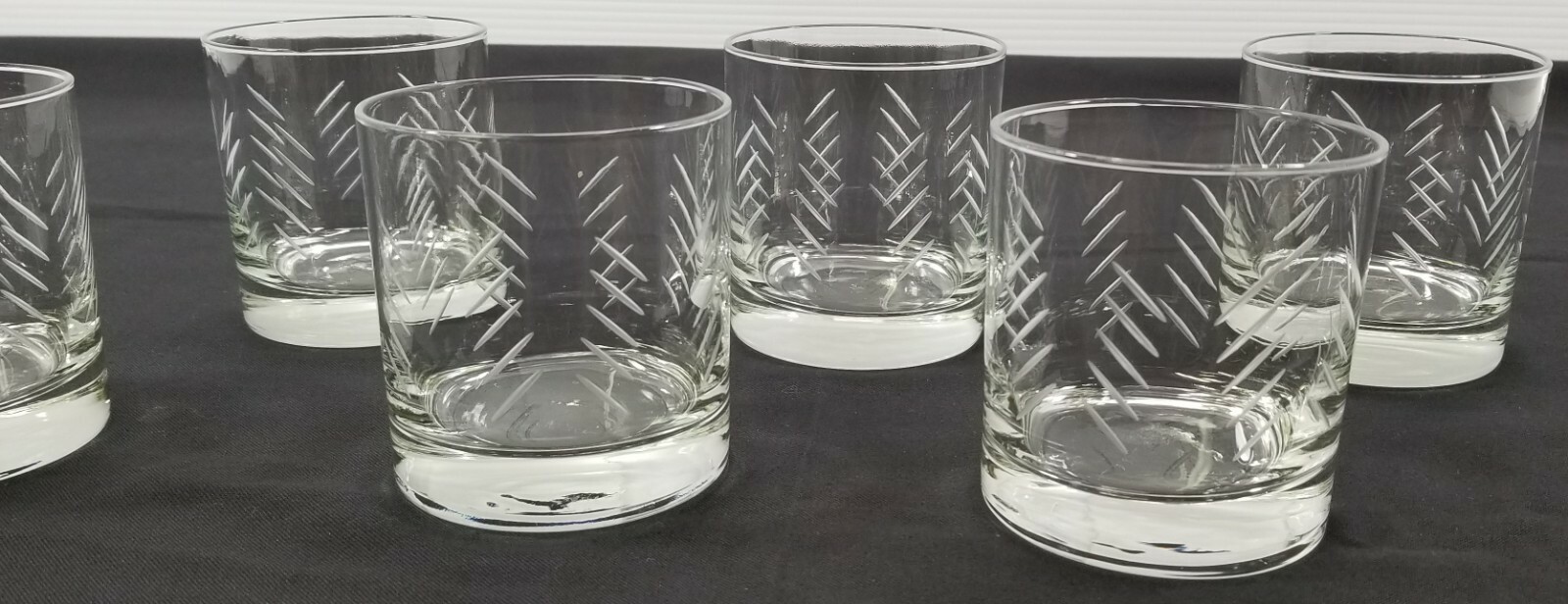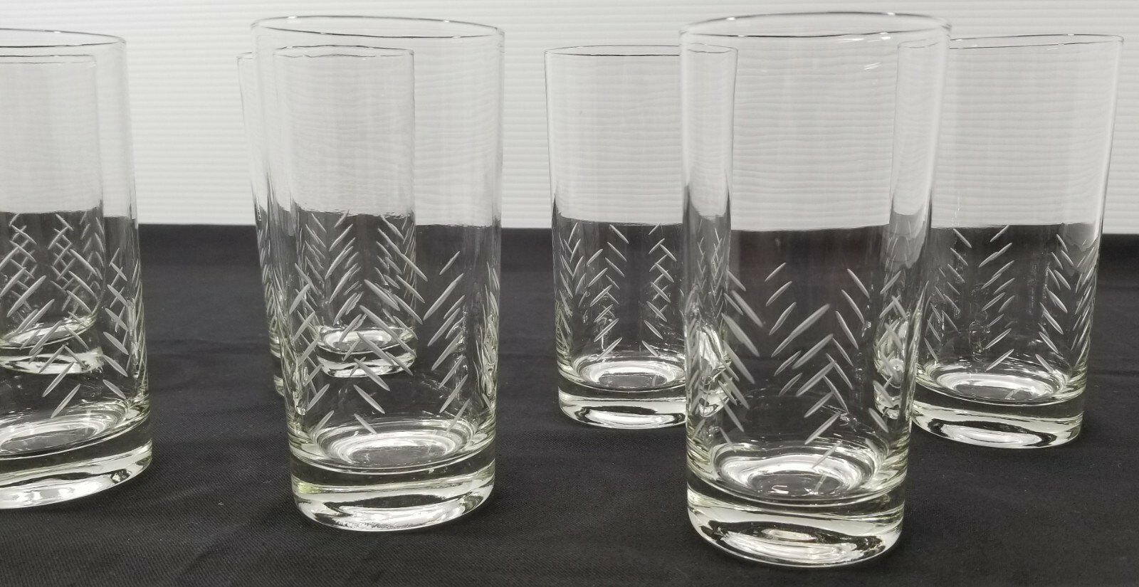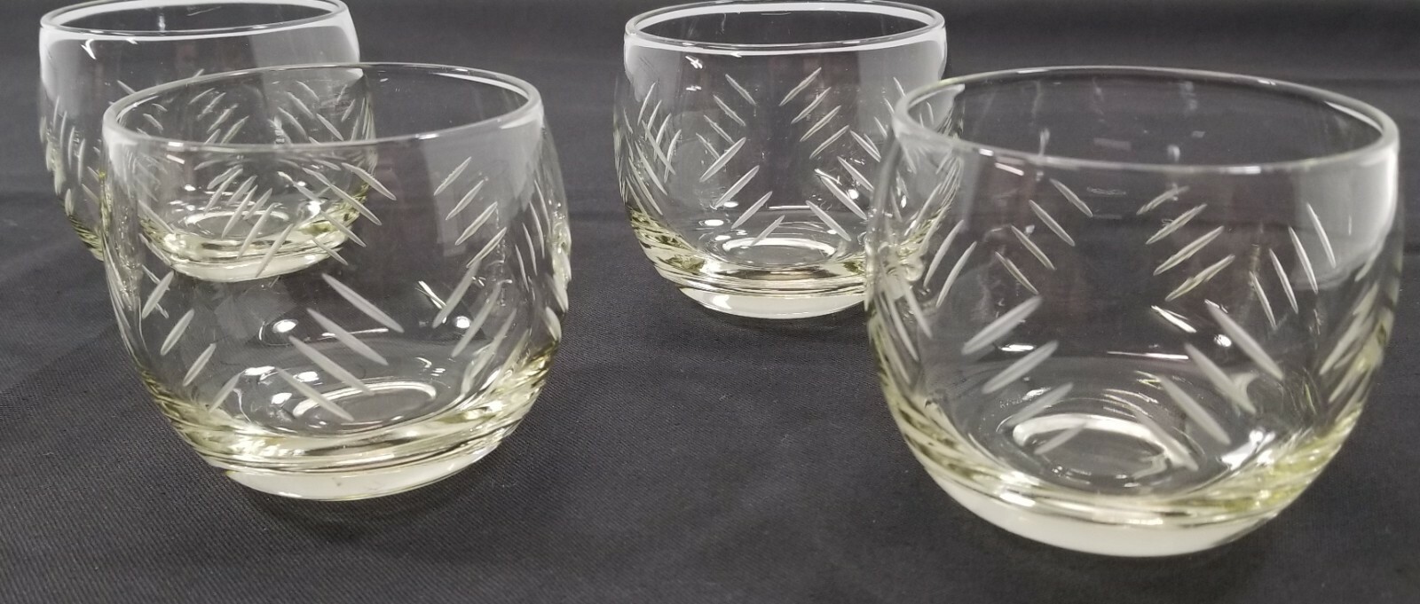 All glasses are in overall good, vintage used condition. There is one visible chip on the rim of a short rock glass. Please see picture. Lot is remainder of a set and NOT COMPLETE.