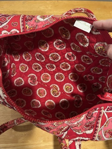 This Vera Bradley duffel bag is perfect for any weekend getaway or day trip. The 18" size is just right for carrying all your essentials, and the Rosey Posey pattern in retired red pink is a great addition to your collection. The pink handle/strap, lining, and hardware color are all in pink, giving this bag a cute and stylish look.