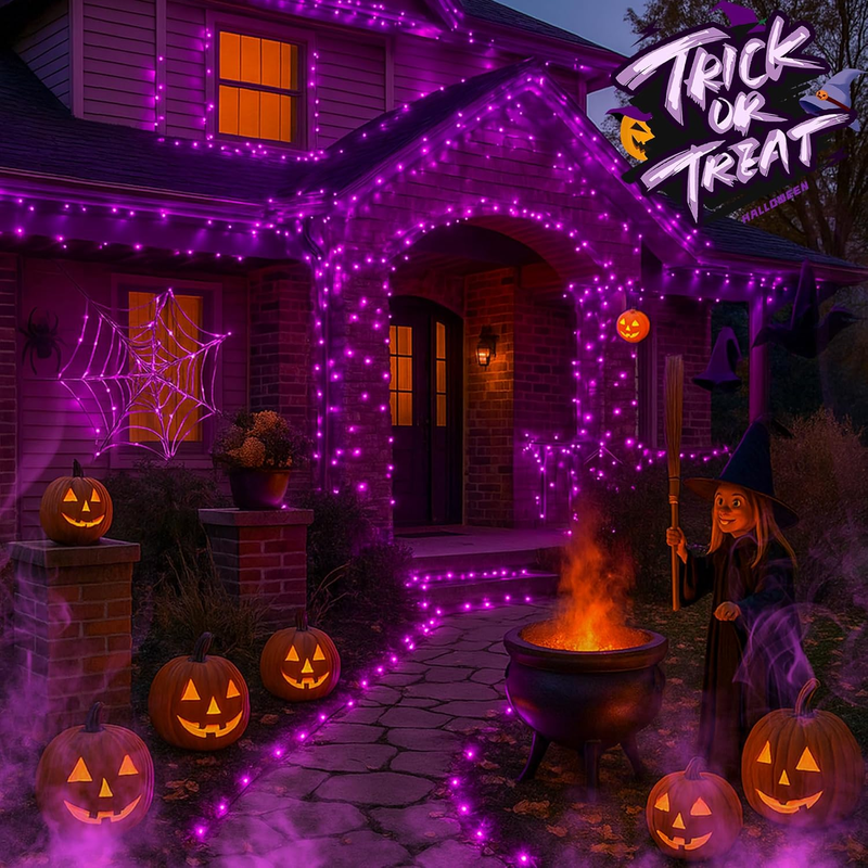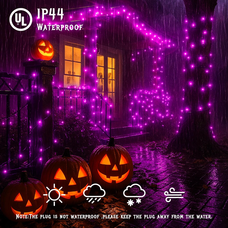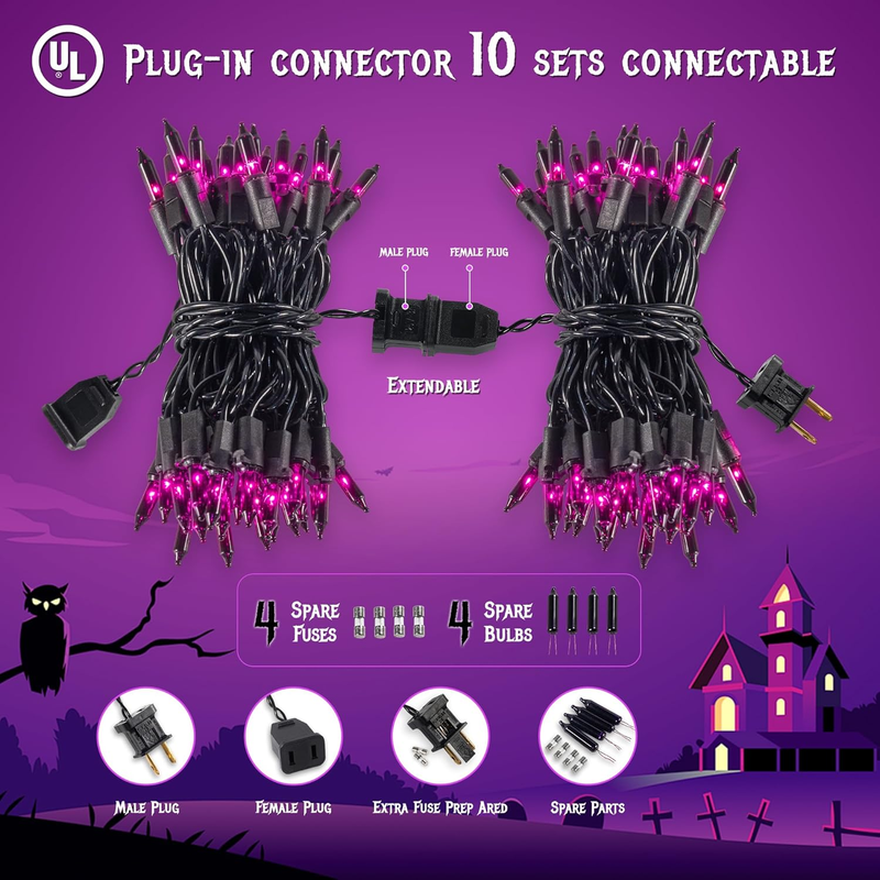 Easy to use and Connectable: Each purple string lights is made with a male and female plug, you can connect up to 10 strands end-to-end to reach a length of 130 feet. Halloween mini incandescent lights has IP44 Waterproof and extremely suitable for enlivening your window, porch railing, or banister in this haunted season, customize your need for large area decorations, creating a grand view of haunting mood.