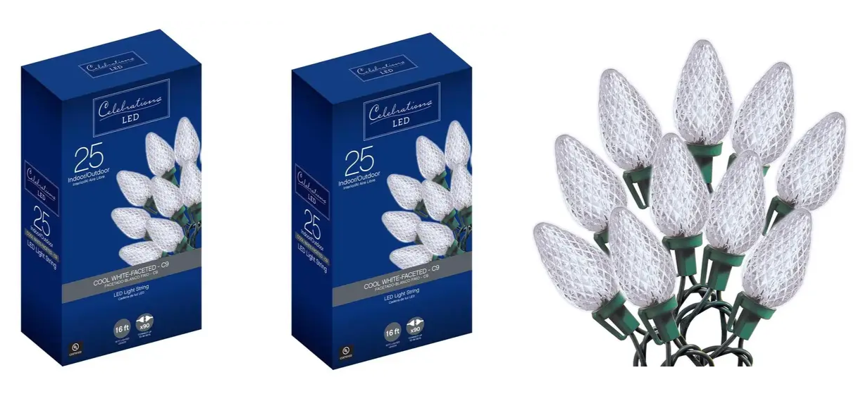Christmas String Light LED C9 25ct 16' ft Cool White, Celebrations 47656-71 2-PACK