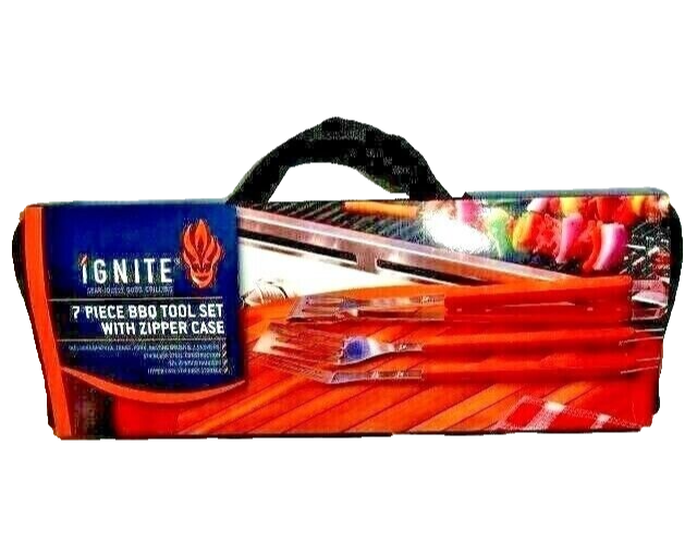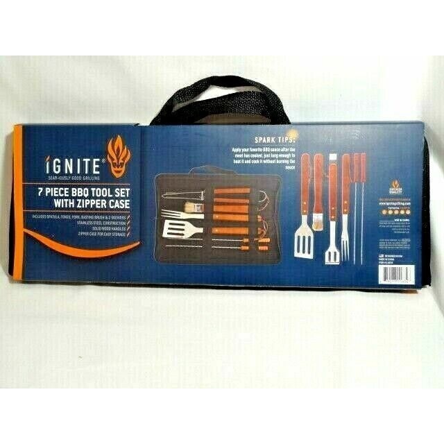 Ignite BBQ Tools 7-Pc Zipper Case Spatula Basting Brush Fork Skewers Tongs NEW