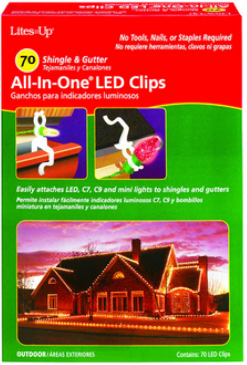 The Dyno All-in-One LED light clips are designed for versatile, tool-free installation of holiday lighting on shingles, gutters, flat tile, and slate roofs. This 70-count pack features durable white plastic clips that securely hold LED light strings in place without nails, tape, or adhesives. Engineered for outdoor use, each clip accommodates a range of bulb sizes and installs quickly on fully assembled light sets?saving time and protecting surfaces from damage. Ideal for both DIY decorators and professional installers seeking a universal, reusable mounting solution.