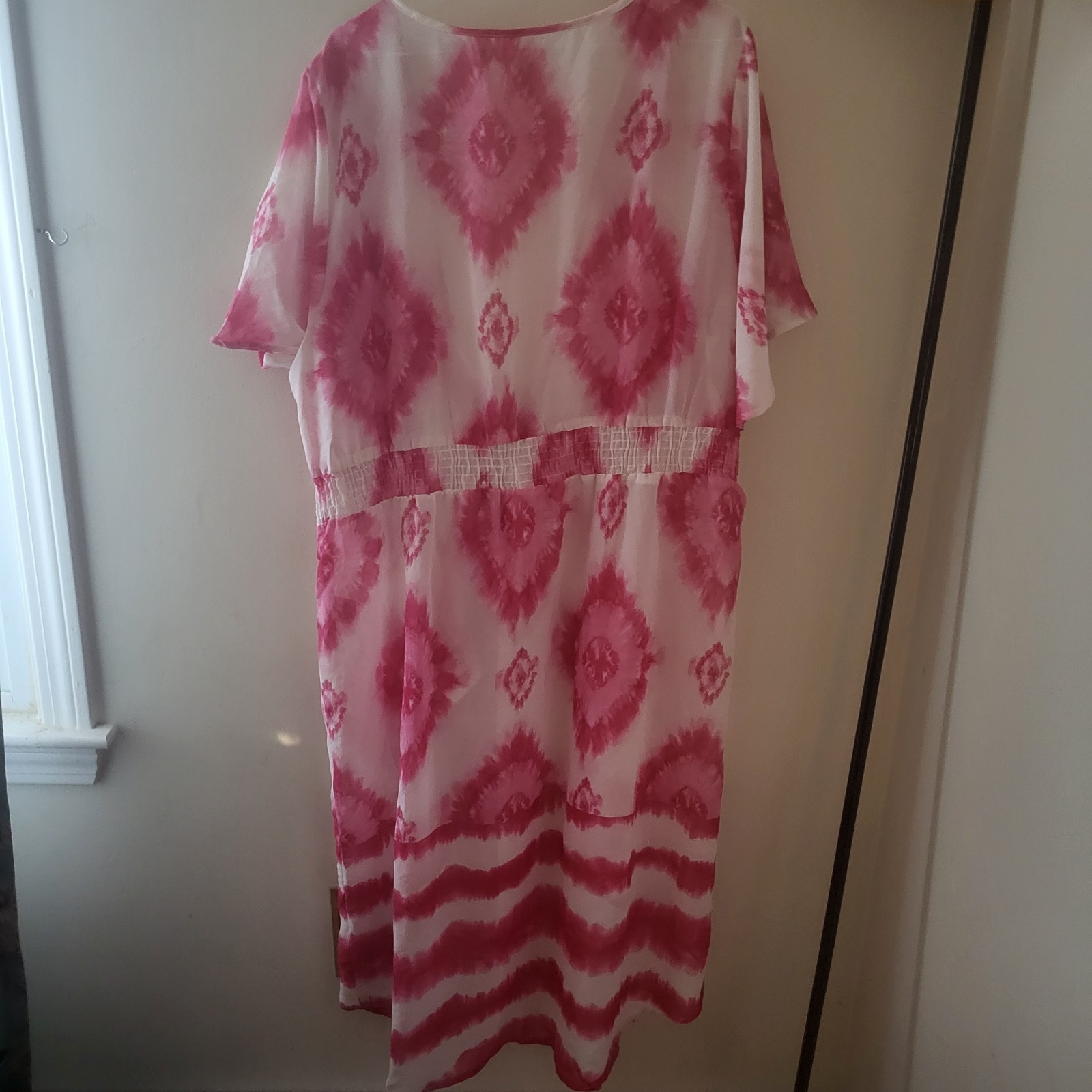 This white and pink lightweight kimono is still new with tag! It has a matching belt. 100% polyester.
