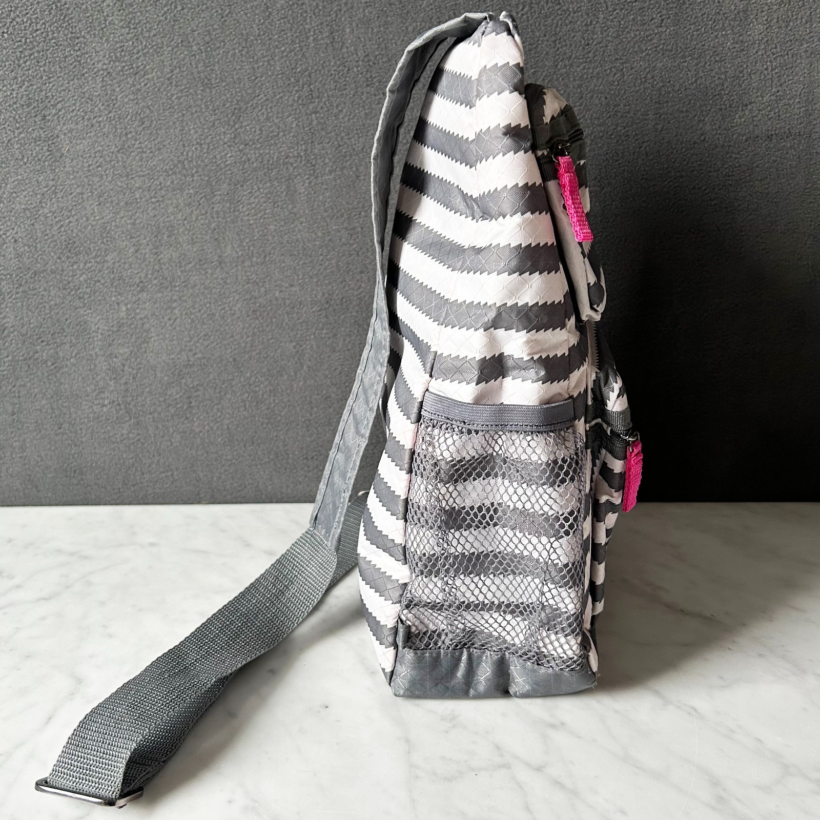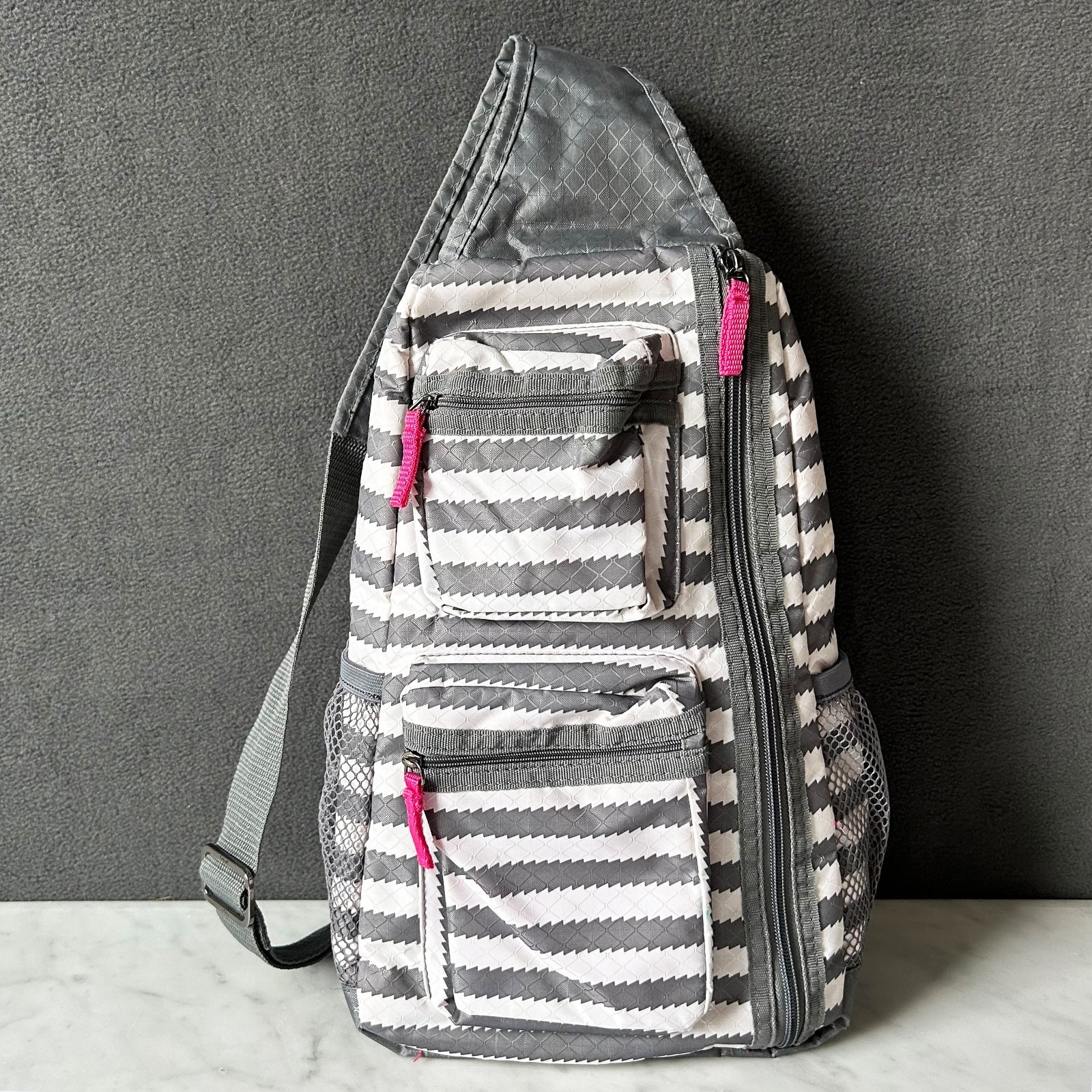 Thirty-One Sling Backpack Gray White Chevron Stripe Crossbody Bag Pink Accents