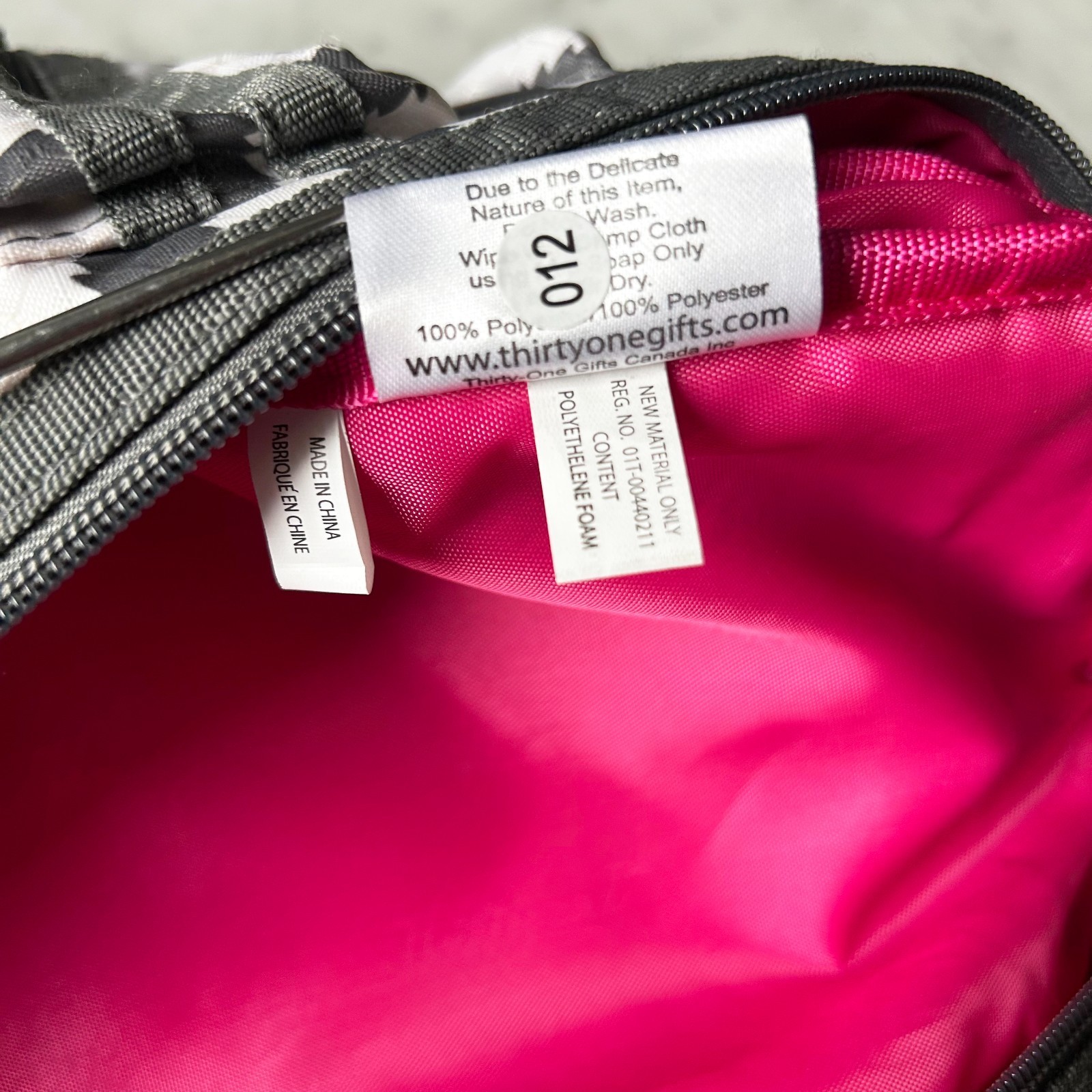 Carry your essentials in style with this Thirty-One sling backpack featuring a bold gray and white chevron stripe pattern and fun pink zipper pulls. Designed for comfort and versatility, this crossbody-style bag keeps your hands free and your items organized whether you?re running errands, traveling, or heading to class.