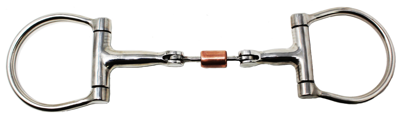 Professional Equine Western D-Ring 4.5" Hinged Mouth Snaffle Bit. Features a copper roller which promote salivation and increases sensitivity within the mouth. Cheeks measure 2 3/4" long. Bit is availble in 4.5", 5", 5.5", 6" mouth sizes.