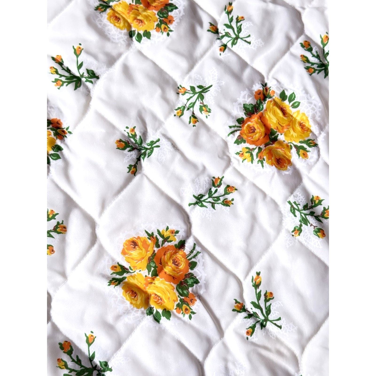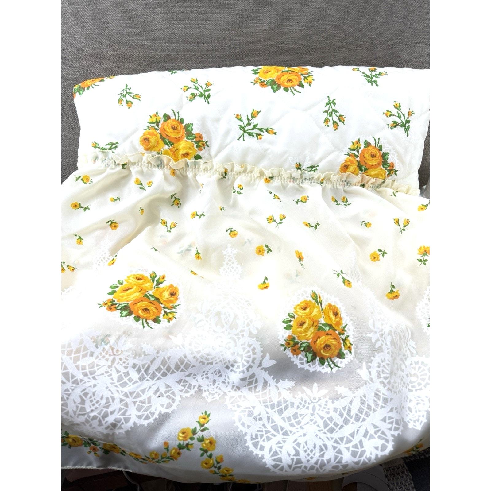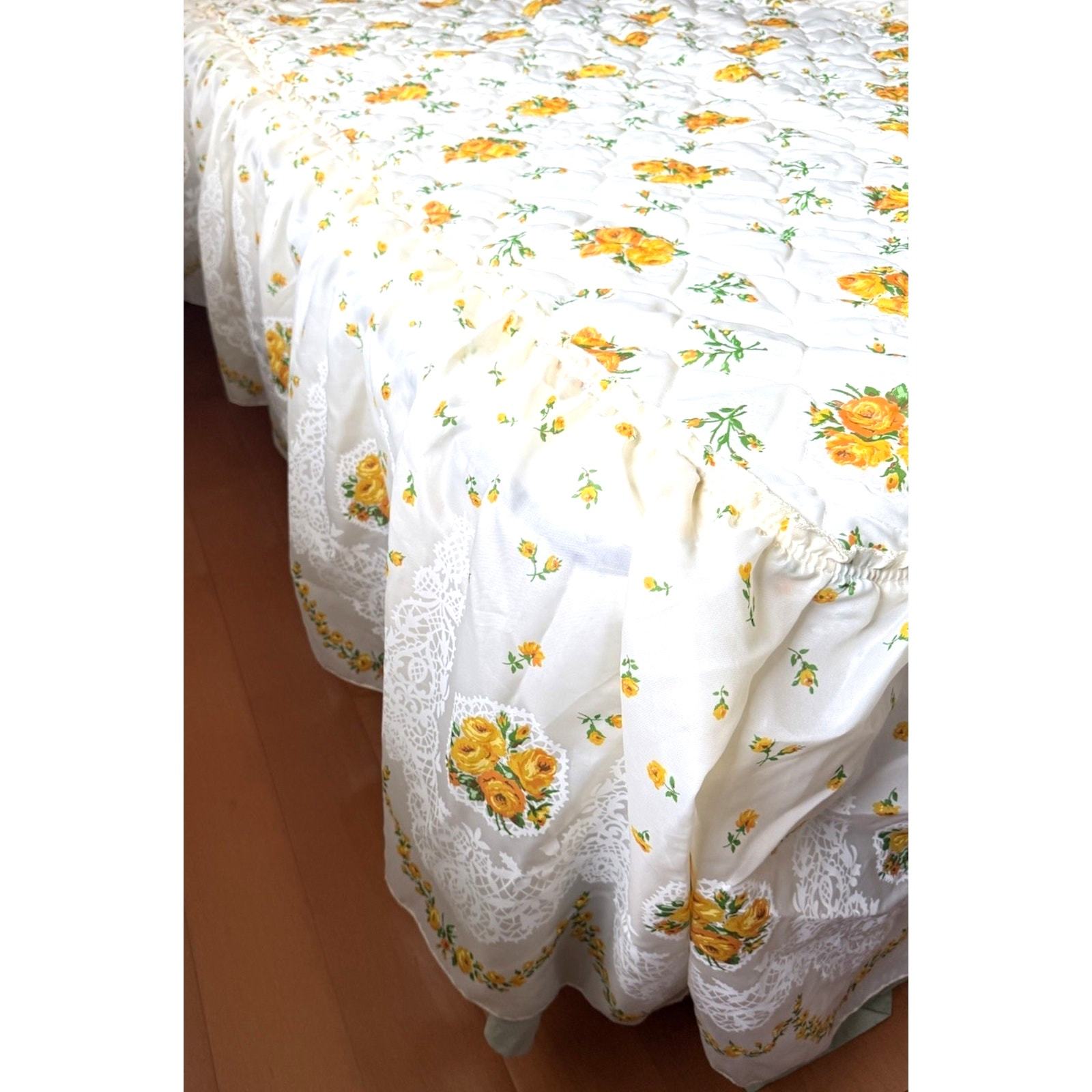 Vintage lightweight quilted bedspread with soft ruffled edges and a delicate floral design featuring yellow and orange roses on a crisp white background. The top features a classic diamond quilt pattern, while the skirted sides display printed lace details and scattered miniature rosebuds. Lightweight and charming, this cottagecore-style coverlet adds a romantic, vintage touch to any shabby chic or farmhouse bedroom.