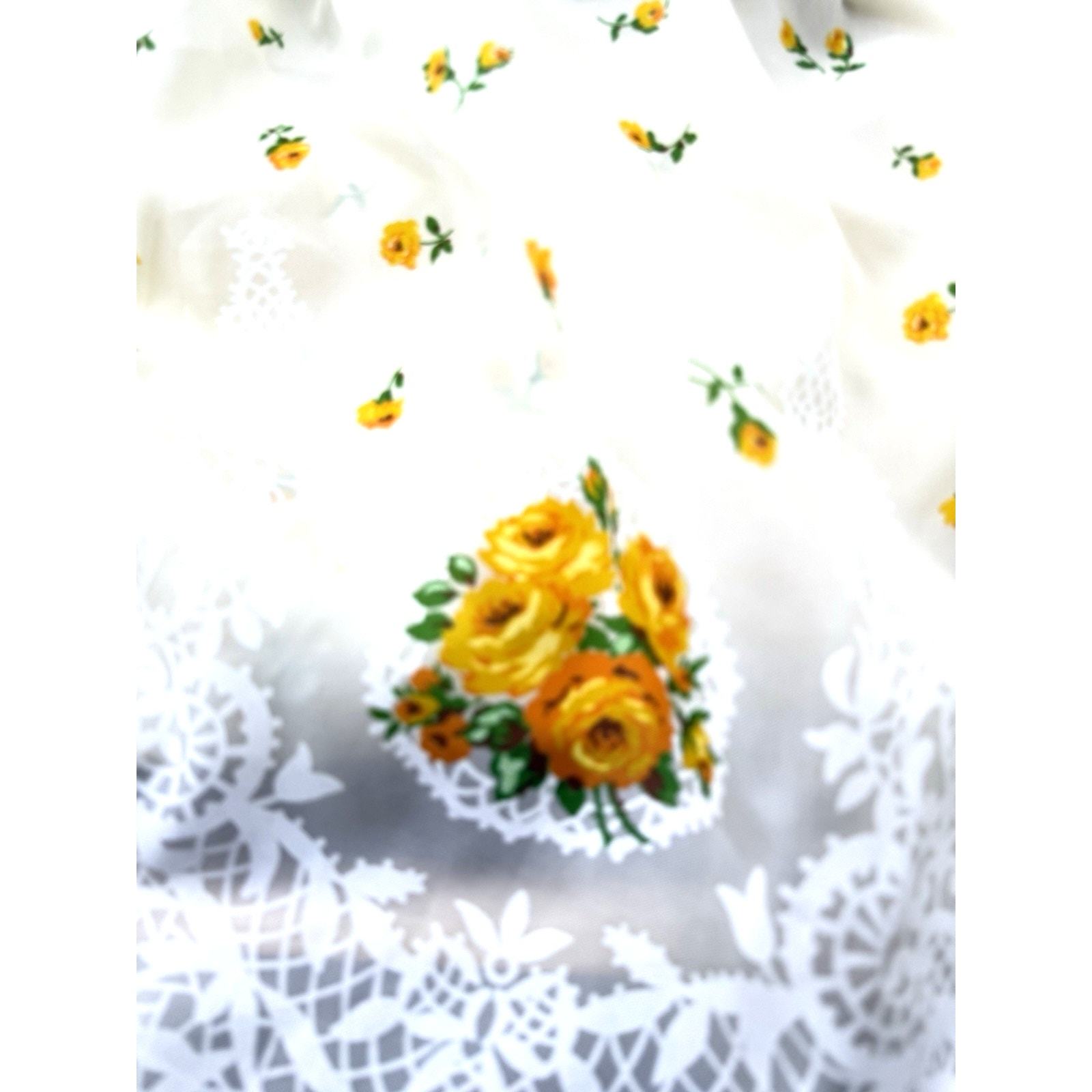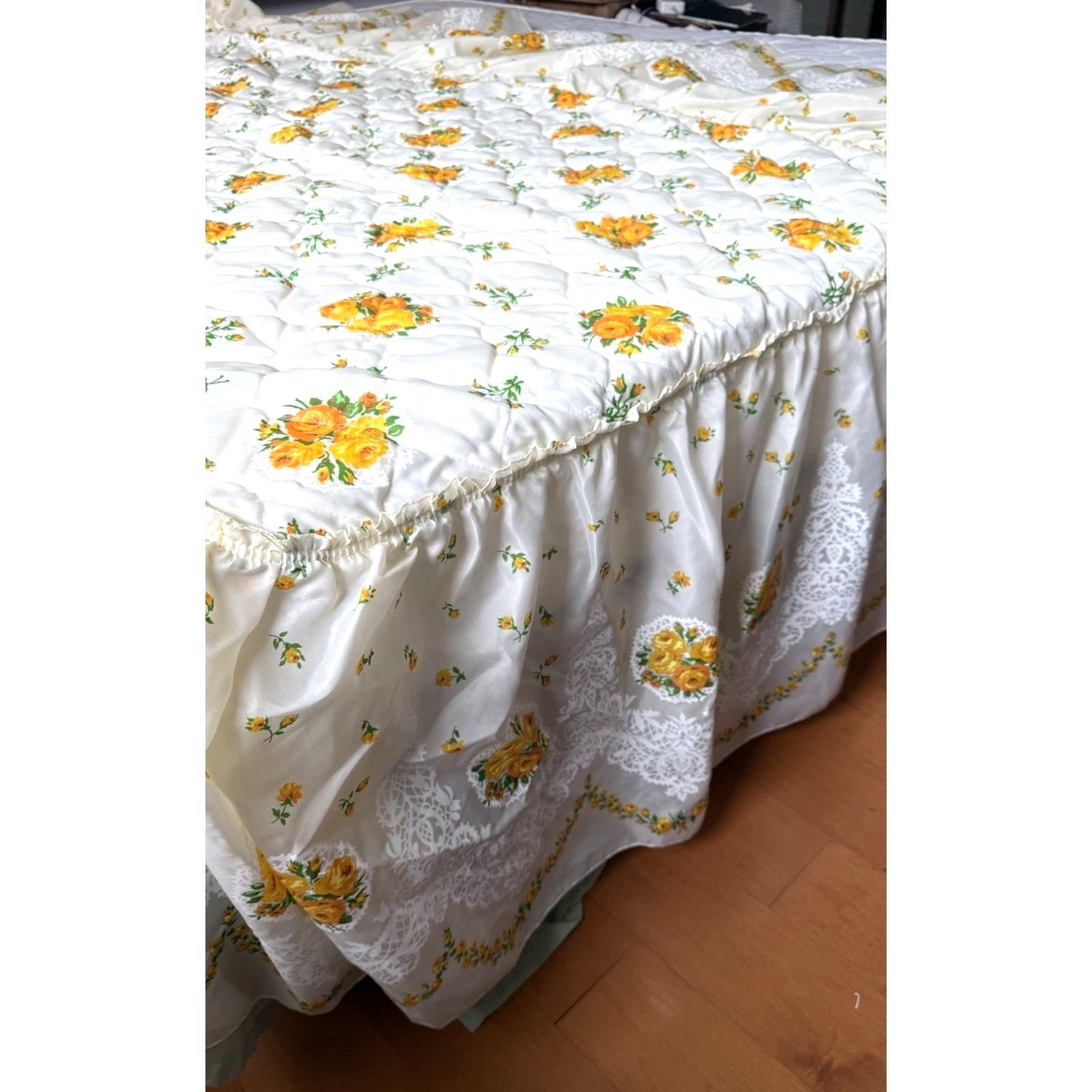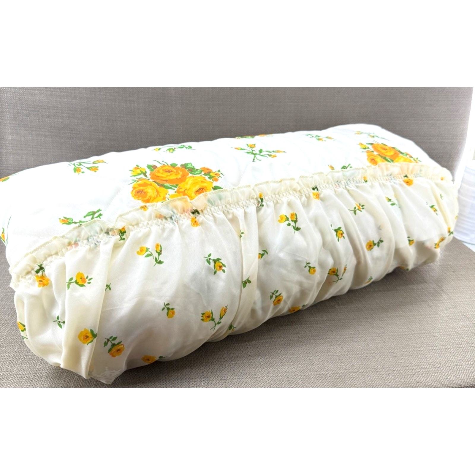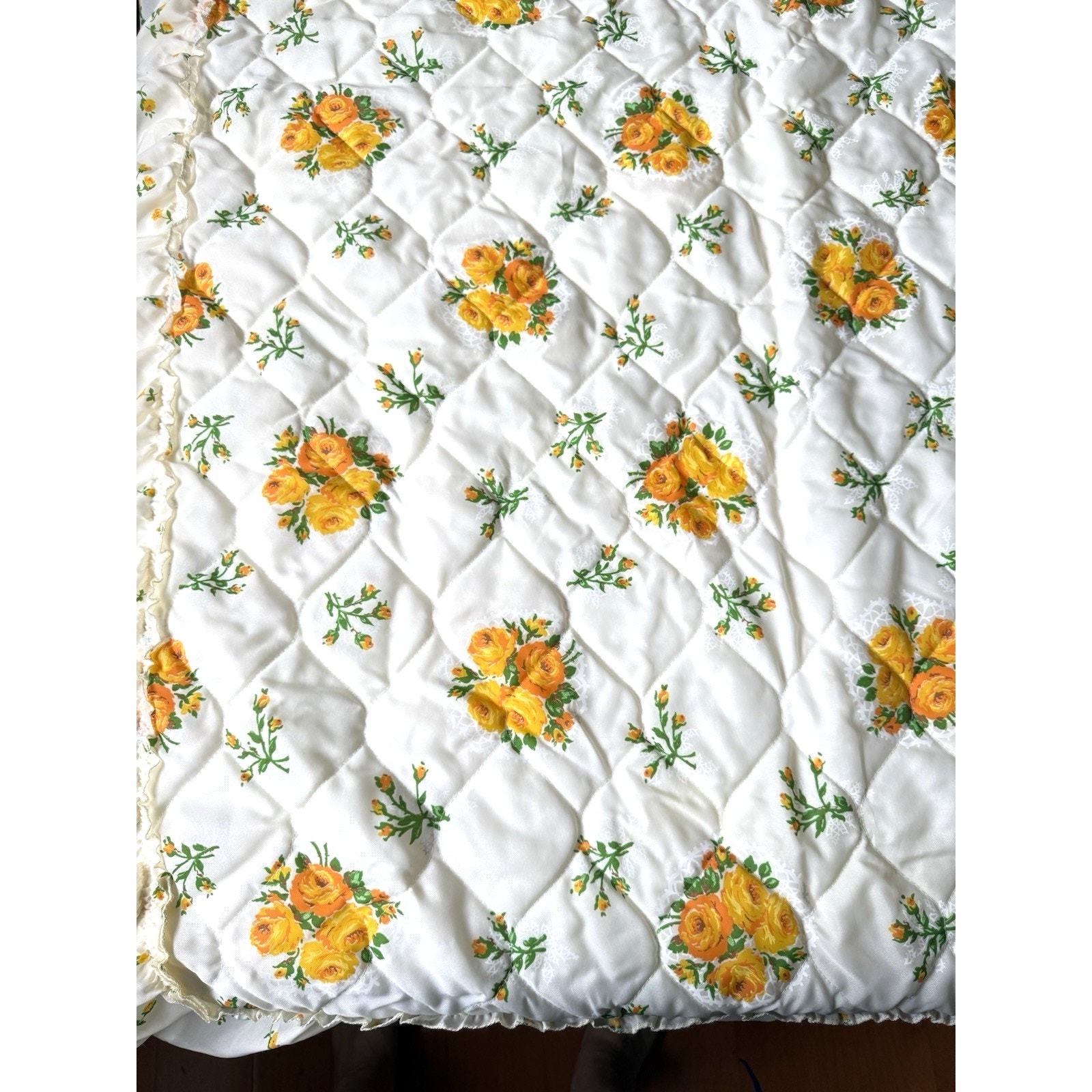 Vintage lightweight quilted bedspread with soft ruffled edges and a delicate floral design featuring yellow and orange roses on a crisp white background. The top features a classic diamond quilt pattern, while the skirted sides display printed lace details and scattered miniature rosebuds. Lightweight and charming, this cottagecore-style coverlet adds a romantic, vintage touch to any shabby chic or farmhouse bedroom.