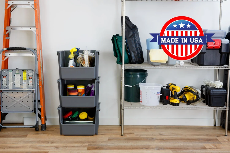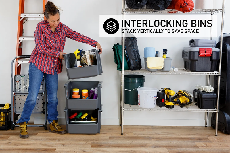 STURDY DESIGN? Storage bins made with heavy duty plastic construction making them rust, water, and corrosion-proof. Ready to contain and hold those large and bulky items around your home. EFFICIENT ? With molded in handles for easy portability, these containers for organizing are great for use throughout the home or garage. Stackable bins save space and make vertical organization easy and accessible. STACKABLE ? These storage bins can be interlocked vertically to save floor space around your home. When not in use, nest each container together to conserve space and make for convenient storage. Can stack up to 4 bins high. ORGANIZATION ? Each storage bin works together to maximize storage around your home when keeping your items easy to access with the wide-open front.