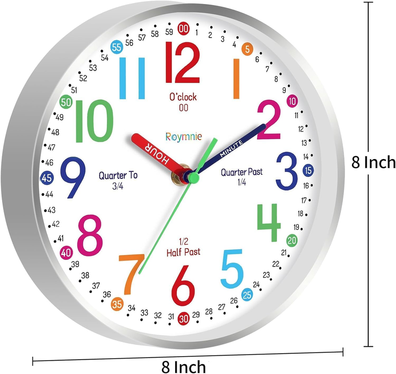 1??Wall Clock for Kids Learning to Tell Time?: The 8 inch wall clock is designed with each hour being a different color with the minutes labeled, colorful clock face inspires kids? interest in learning how to tell time.