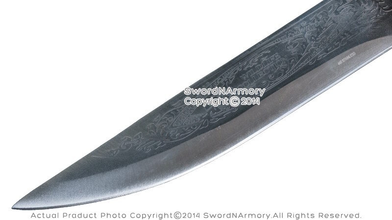 [Blade] The blade of the dagger has been constructed from 440 Stainless Steel. An acid etched design decorates the top of the dagger. The dagger comes sharpened.