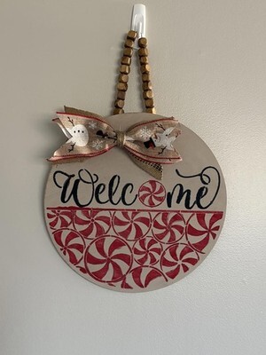 Features a festive design with red peppermint swirls and a warm "Welcome" message.