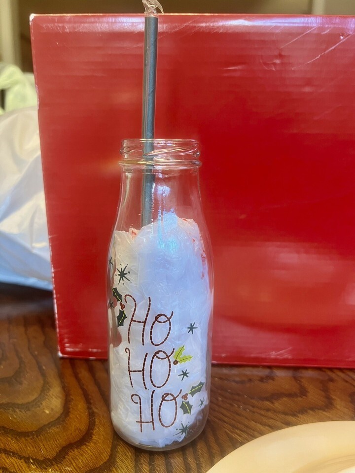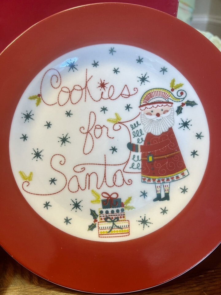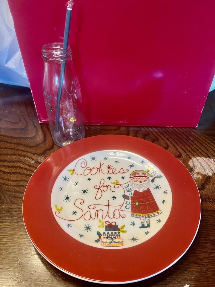 New Santa Snack Plate Milk Jar And Straw Set Santa's Cookie Plate Glass. Item is new, box is rough.