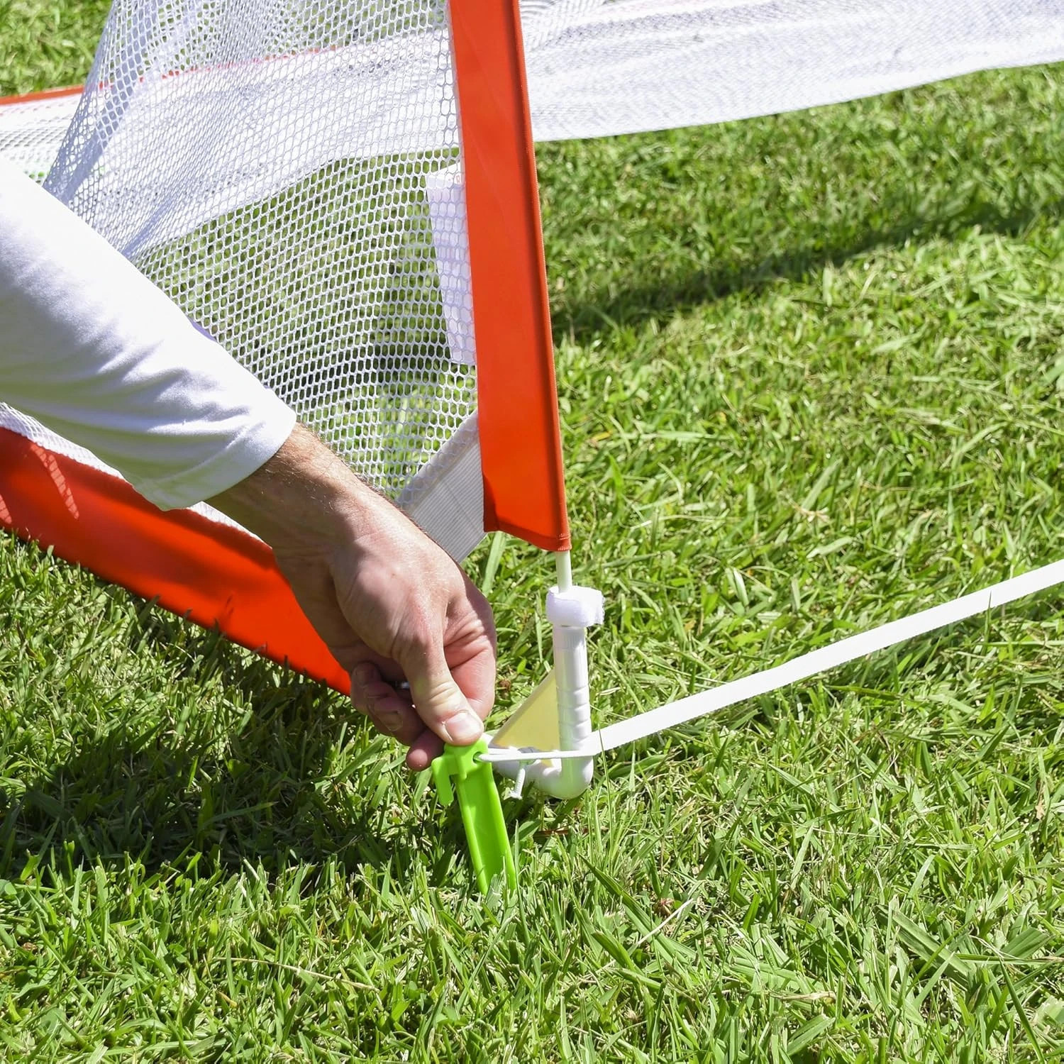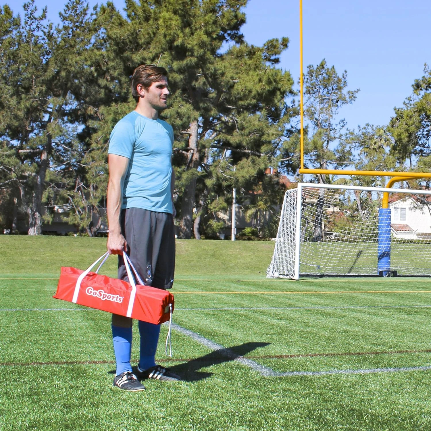 Soccer players have long been in need for a durable goal set that's portable and easy to set up, and not until now has there been a more affordable, premium construction, and easy to set up portable goal set. The GoSports Portable Goal Set includes features that are hard to come by anywhere else such as an all-weather design inspired by Major League Soccer, which is an all-weather league. With this surprisingly compact and portable goal set, you're ready for a game, scrimmage, or training session in minutes and ready to hit the field just like the pros without sacrificing quality or overpaying. That's because the GoSports Portable Goal Set is built to last so you're sure to get maximum value for your dollar. As an added bonus, this portable goal set includes everything else you need to set up and play: the reliable stakes will keep your goals securely planted on the field and the included (6) cones can be used to mark field boundaries or used for training. Plus a convenient carrying case is also included to make for easy portability and compact storage. The GoSports Portable Goal Set's lightweight design is only improved upon by the premium construction materials carefully selected to make for a durable and affordable choice for drills and games that last all day!.