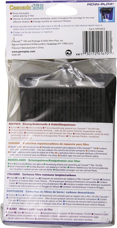 The Penn Plax Cascade 150 or 200 GPH Filter Cartridges with Activated Carbon will improve the quality of your aquarium water and keep your fish healthy. This 3 Pack of Filter Cartridge Replacements is designed to fit both Cascade 150 / 200 GPH hang-on power filters and will last 6 to 12 weeks depending on the conditions of your fish tank. Activated carbon is great for freshwater aquarium filtration. It has the ability to not only visually clear the water; but trap pollutants in the pores of the carbon so they do not enter the water. This filter cartridge will remove ammonia; nitrites; odors and other harmful toxins from your aquarium to keep it healthy. It has a poly-fiber floss barrier which screens out particulate matter and debris for an extra layer of protection. Within 24 hours you will see a drastic difference in the water quality. Each filter cartridge is perfectly measured to fit into the Cascade 150 / 200 Hang On Filter tray without any gaps preventing debris and contaminants from entering back into the water. This filter cartridge is suitable for both freshwater and marine environments. When used together; the Cascade 150 Model CPF3 / 200 Model CPF4 Filters and Cascade filter cartridges provide maximum protection against water pollutants from harming your fish. This is for one package with three replacement cartridges.