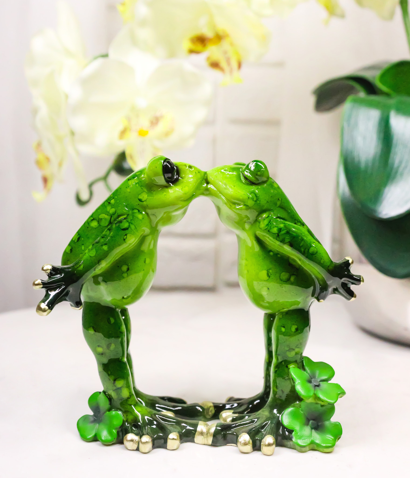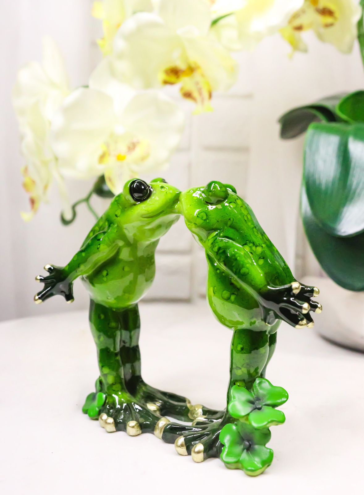 ? Celebrate love and whimsy with the Green Frog Couple With True Love's Kiss Decorative Figurine. This charming piece captures two adorable frogs sharing a sweet kiss amid delicate lily pads, symbolizing affection and togetherness. Crafted with delightful detail and a glossy finish, it brings a touch of romance and playfulness to any home, garden, or office space. Perfect for frog lovers and collectors of heartwarming decor!