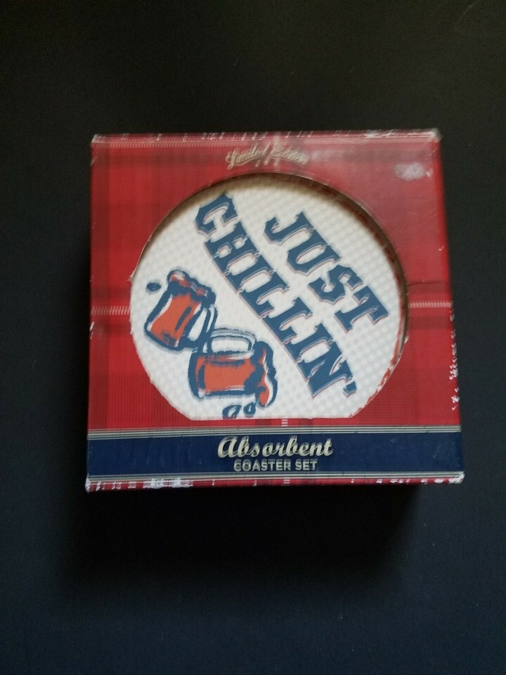 Limited Edition Absorbent Coaster Set Cold Beer Here Just Chillin NEW. Condition is New. Shipped with USPS First Class Package.