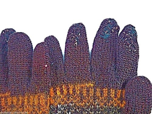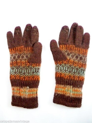 Knitted (stockinette stitch )gloves in brown, orange, and teal with 1/1 ribbing at the cuff. They measure 8 oe? long, 5? around the wrist, and 5 oe? around the widest part of the hand. The gloves have one hole as pictured and are darned as shown. Just a great example of knitwear of the era. They were found stored in a trunk and would be ideal for design.
