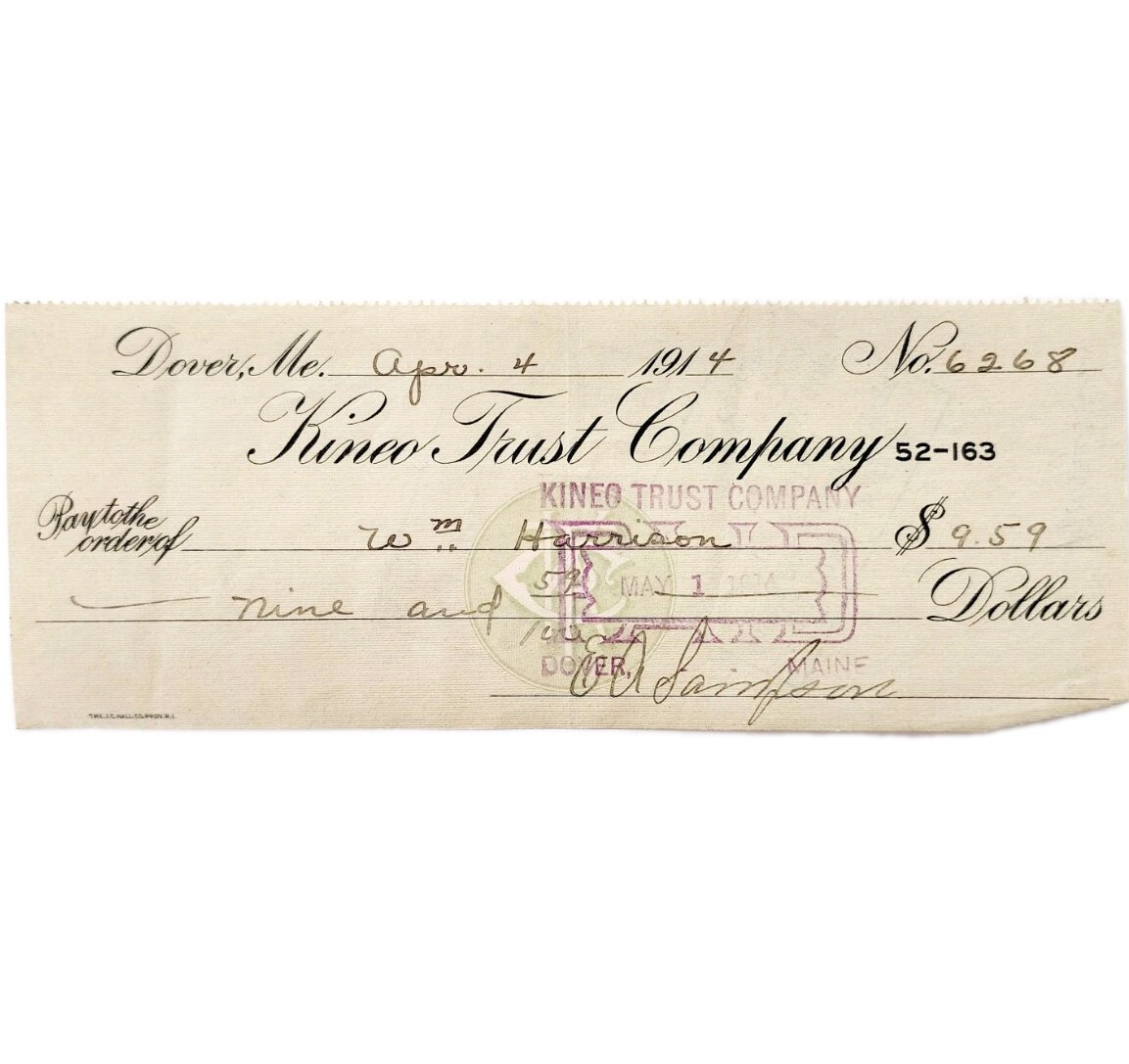 1914 Kineo Trust Company Bank Check E.A. Sampson Dover Maine Signed 6268 CHX12
