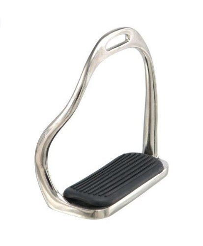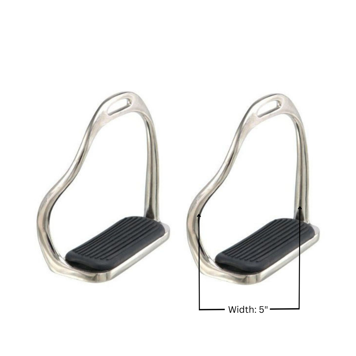 Challenger Bent Leg Safety Stirrups are made with durable, lightweight rust-free stainless steel. The Bent Leg features helps keep the feet from getting stuck in the stirrups in case of a fall. Features a changeable rubber ridged tread that provides extra grip and stability. Fits most english stirrup leathers. Measurements: 4-3/4" Wide