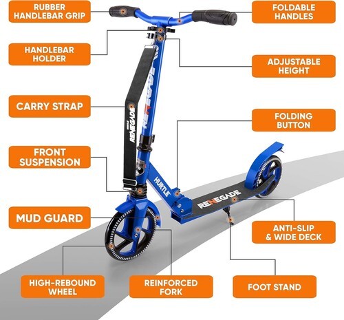 LIGHTWEIGHT ALLOY DECK: The Kick Scooter for kids and adults features a durable alloy deck, perfect for indoor and outdoor use, with an extended standing area for improved performance. Supporting riders up to 220 LB, it's suitable for ages 8 and up.