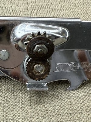 Classic Vintage Swing-A-Way can opener, made in the USA, featuring red transparent handles and sturdy all-metal construction. A timeless mid-century kitchen essential known for its durability and reliability.