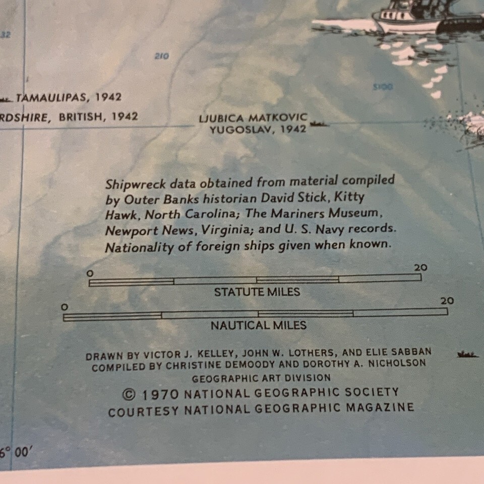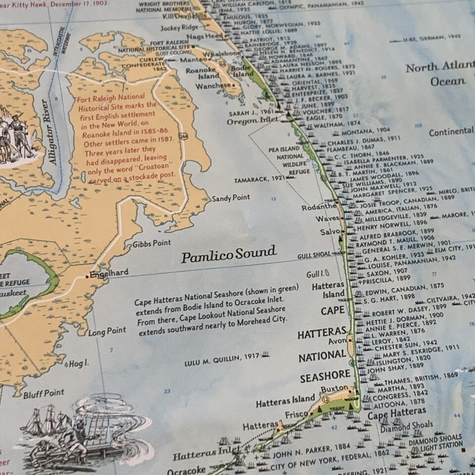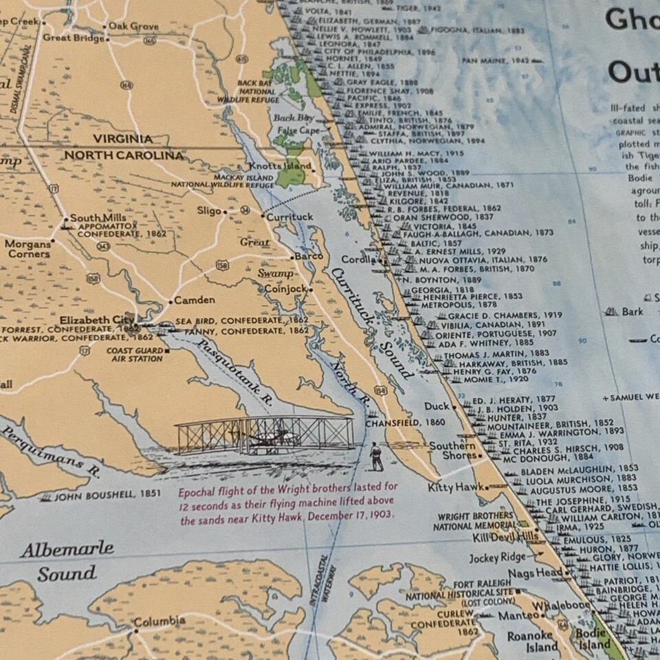 1970 National Geographic Map Ghost Fleet Outer Banks North Carolina Vintage