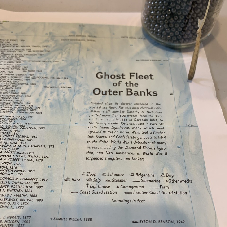 National Geographic map, Outer Banks, North Carolina coast, Ghost Fleet, 1970s map, vintage nautical chart, shipwreck map, Cape Hatteras, maritime history, collectible map print, National Geographic Society.