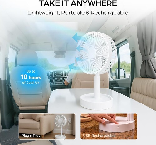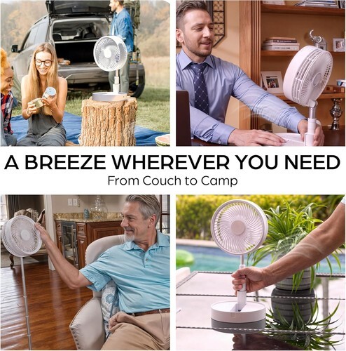 The My Foldaway Fan Folding Fan is the only fan you need for your home, office, or vacation- This fan foldable design is ideal for home, office, and travel use while the rechargeable design makes it a perfect fit for use on the go or outdoors. Simply fold the fan and place on your desktop or bedside for a cool breeze or extend the fan to stand and cool down an entire room. Extendable Fan: The My Foldaway Fan features a telescopic neck and is extendable from up to providing multiple use options, making it ideal for desktops, bedsides, sofas, kitchens, living rooms, outdoors, cars, and more. The My Foldaway Fan is the ideal fan for use on the go, in your home, at work, or even outdoors. Simply charge the fan, unfold it, and use anywhere you desire.