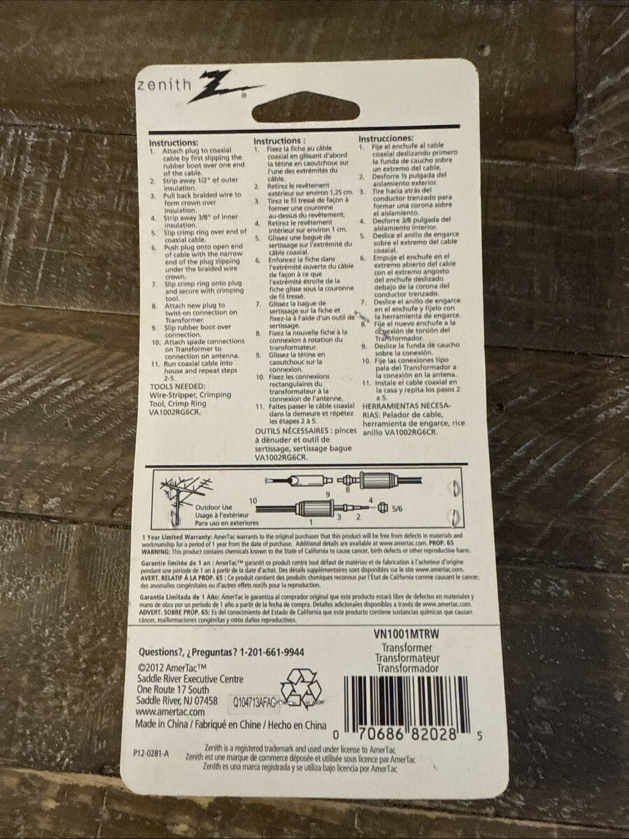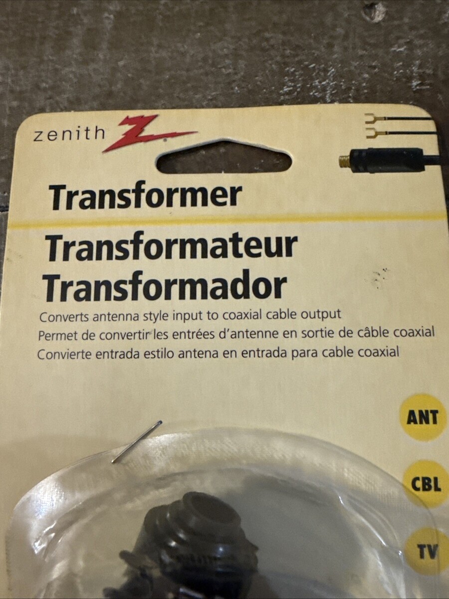The Zenith Antenna Transformer model VN1001MTRW is a black, outdoor device designed to transform 300 Ohm input to 75 Ohm output for optimal television signal reception. As a reliable brand in the industry, Zenith ensures quality and performance in their antenna transformers. This specific model is manufactured with the part number VN1001MTRW, providing a seamless solution for converting antenna signals to ensure clear and strong TV reception.